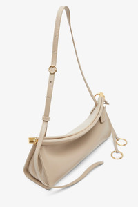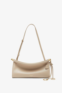 Greige leather shoulder bag from Alaia. The Le Click East West small shoulder bag is made of glossy calfskin leather in a curved silhouette that hugs the body, featuring a hinge opening system, decorative ties with metallic rings, an adjustable strap and suede leather lining inside. - Measurements: L25 x H12 x D8cm - Made in Italy Product Code: AA1S01426CA332824