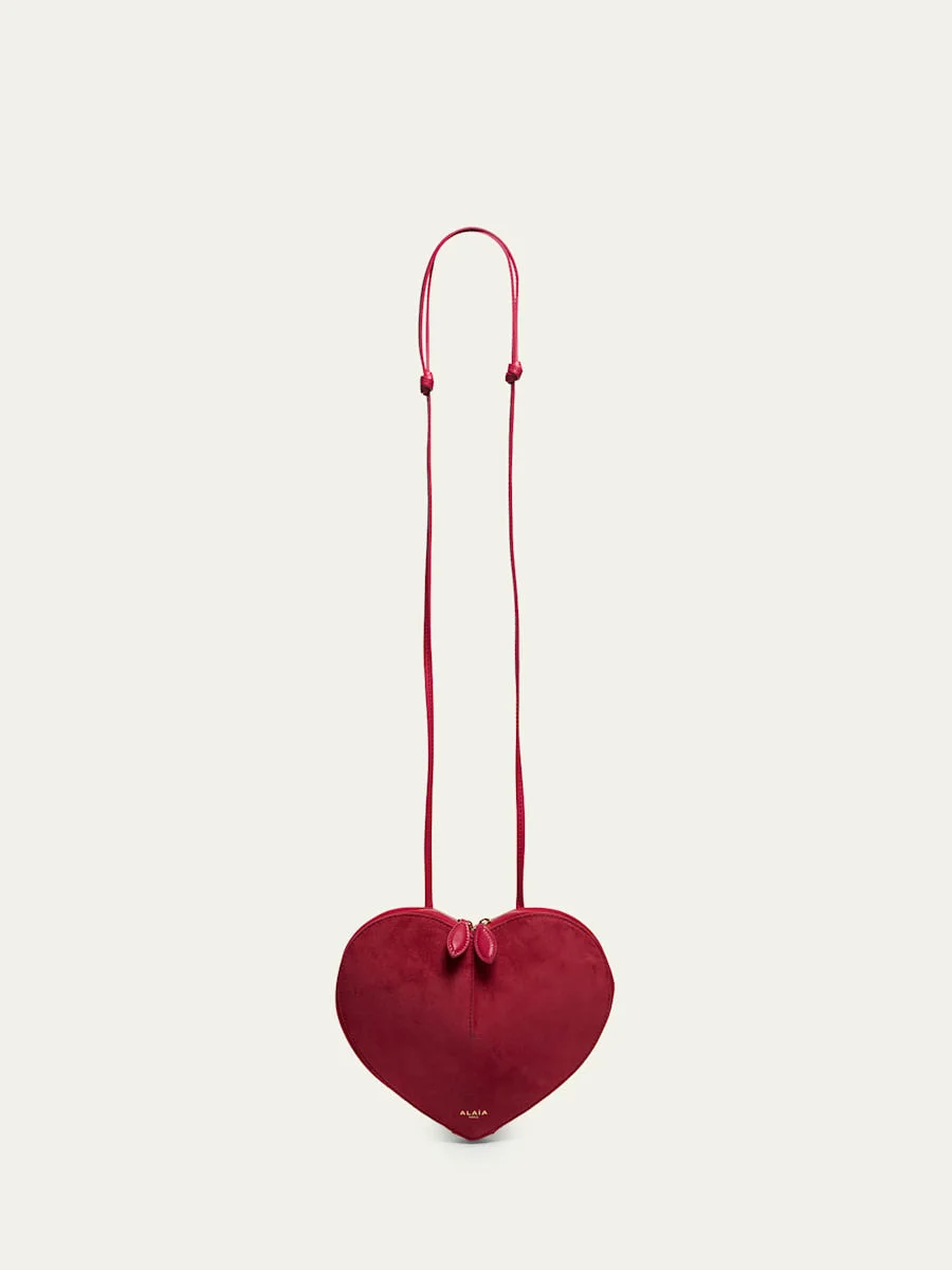 Formed in a heart shape, the "Le Caur" crossbody bag by ALAIA is made of suede with leather piping and details Adjustable crossbody strap Twoway zip top closure Lining: Leather Approx. 6.7"H x 8.3"W x 2"D Professional cleaning recommended Made in Italy