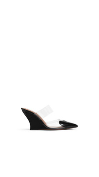 DETAILS Wedge mules with the signature heart cut at the front of the shoe 90 mm heel Patent leather with transparent polyuretane Made in Italy MATERIALS Highlights MAIN LINING: 100% LAMBSKIN LEATHER SOLE: 80% CALFSKIN LEATHER, 20% RUBBER UPPER MATERIAL 1: 100% POLYURETHANE UPPER MATERIAL 2: 100% CALFSKIN LEATHER HEEL: 100% CALFSKIN LEATHER PRODUCT REFERENCE: AA3M3005CK150-999