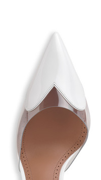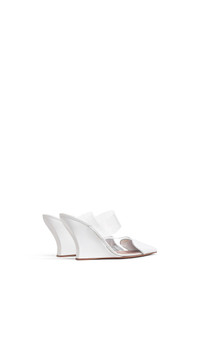 DETAILS Wedge mules with the signature heart cut at the front of the shoe 90 mm heel Patent leather with transparent polyuretane Made in Italy MATERIALS Highlights MAIN LINING: 100% LAMBSKIN LEATHER SOLE: 80% CALFSKIN LEATHER, 20% RUBBER UPPER MATERIAL 1: 100% POLYURETHANE UPPER MATERIAL 2: 100% CALFSKIN LEATHER HEEL:100% CALFSKIN LEATHER PRODUCT REFERENCE: AA3M3005CK150-010