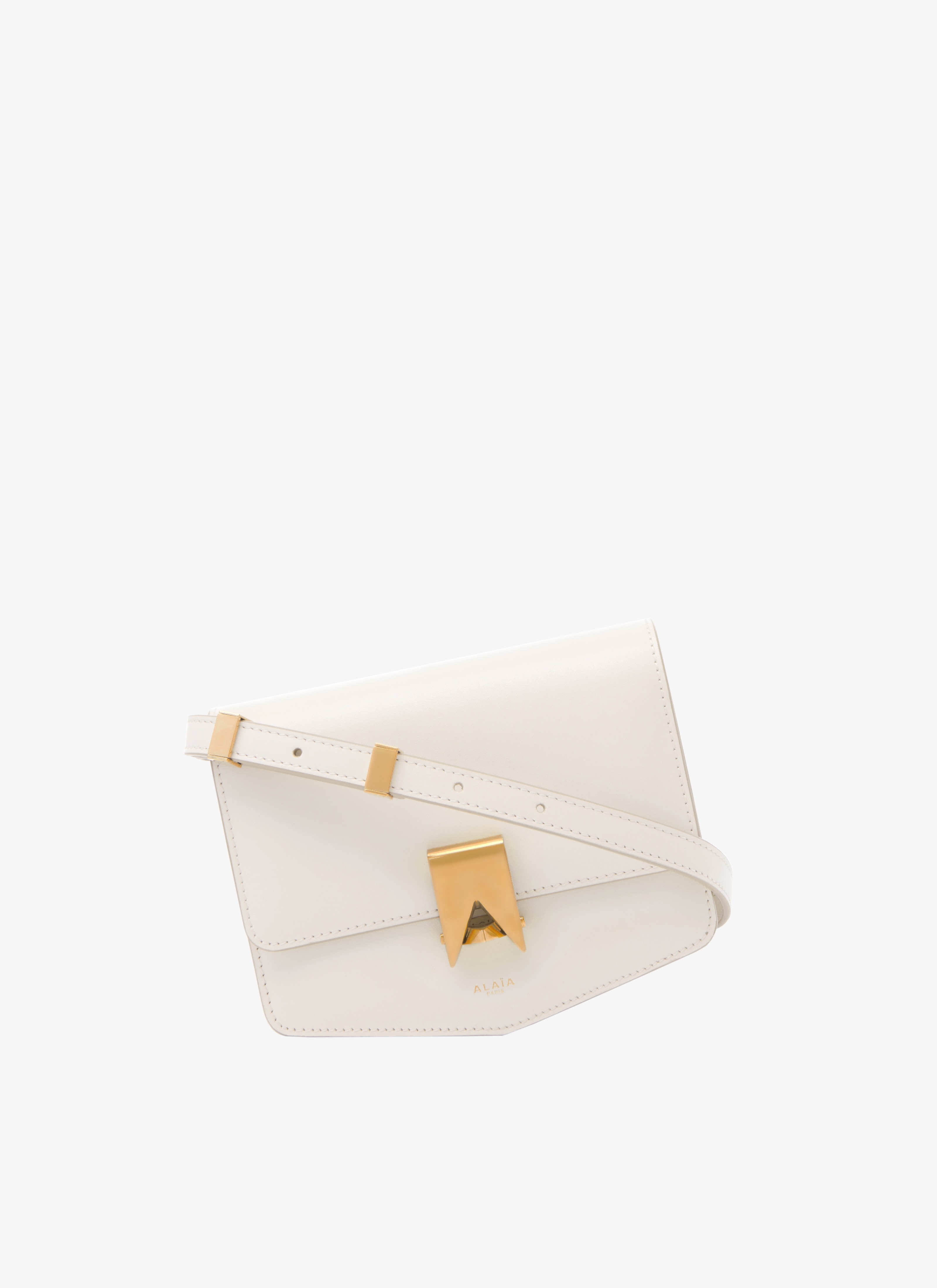 Small shoulder bag with shaped bottom, lock inspired by architectural lines and forming an "A" for Alaïa, very functionnal thanks to three gussets, adjustable strap and back pocket, bag fits a phone. Dimensions (cm): l 17 x h 13 x d 6.5. Made in Italy DETAILS COMPOSITION: 100% CALFSKIN LINING: 100% CALFSKIN PRODUCT REFERENCE: AA1S01417CA191 - 030