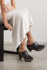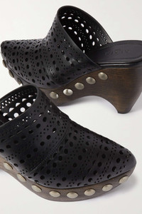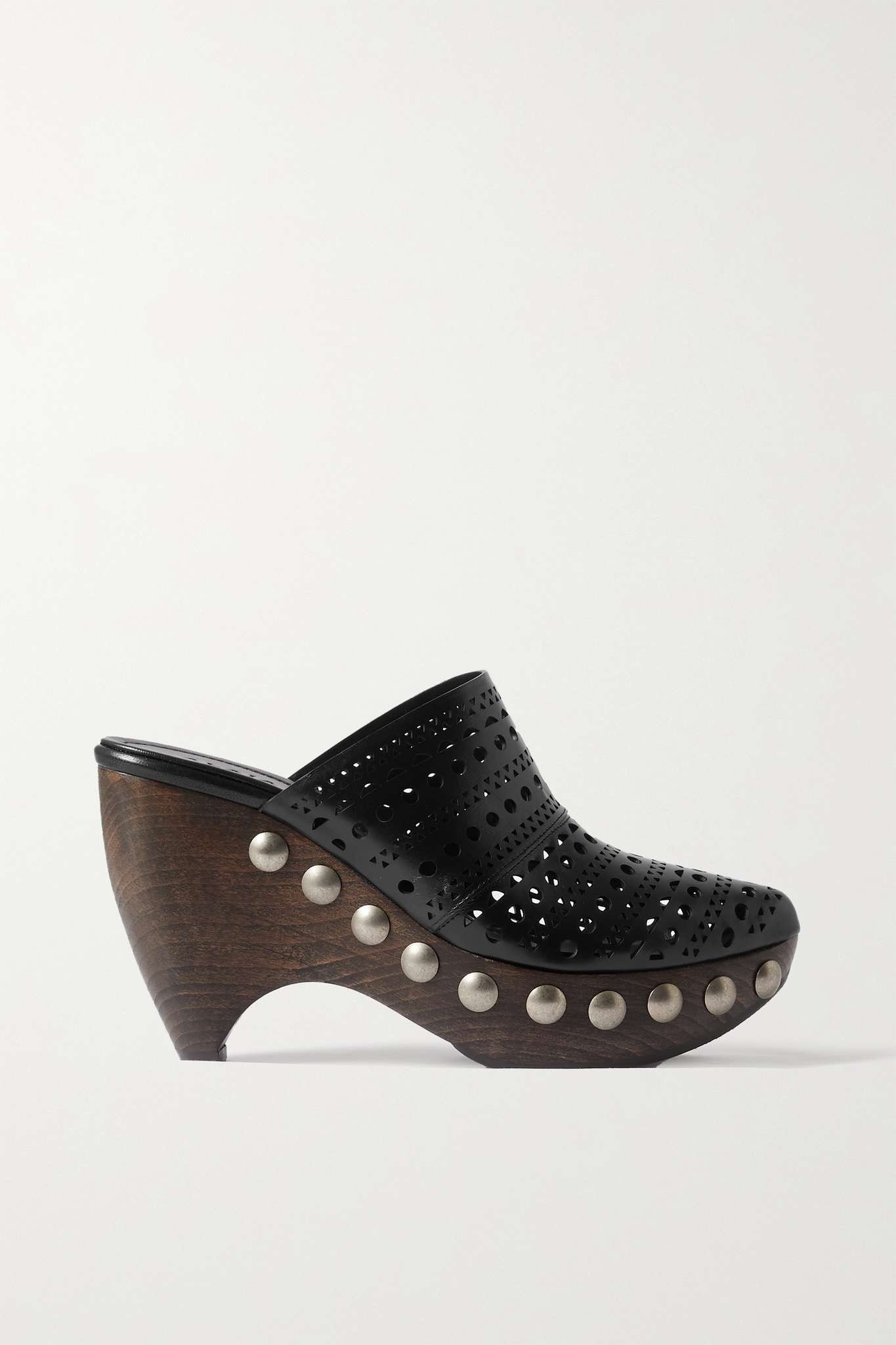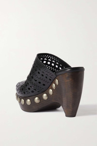 EDITORS'NOTES For his debut collection at Alaïa, designer Pieter Mulier pays homage to some of the illustrious house founder's signatures. Worn on the runway, these clogs are made from meticulously laser-cut leather and finished with silver-tone studs. The 3.5-inch platform heel is so sculptural and unique. SIZE & FIT - Fits true to size, take your normal size - Only available in full sizes, go up to the nearest whole size if you take a half size - Italian sizing DETAILS & CARE - Heel measures approximately 85mm/ 3.5 inches - Black leather - Slip on