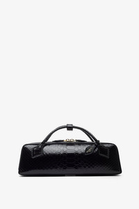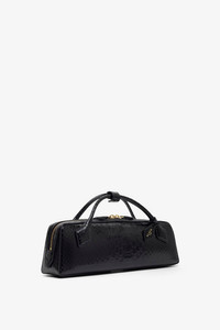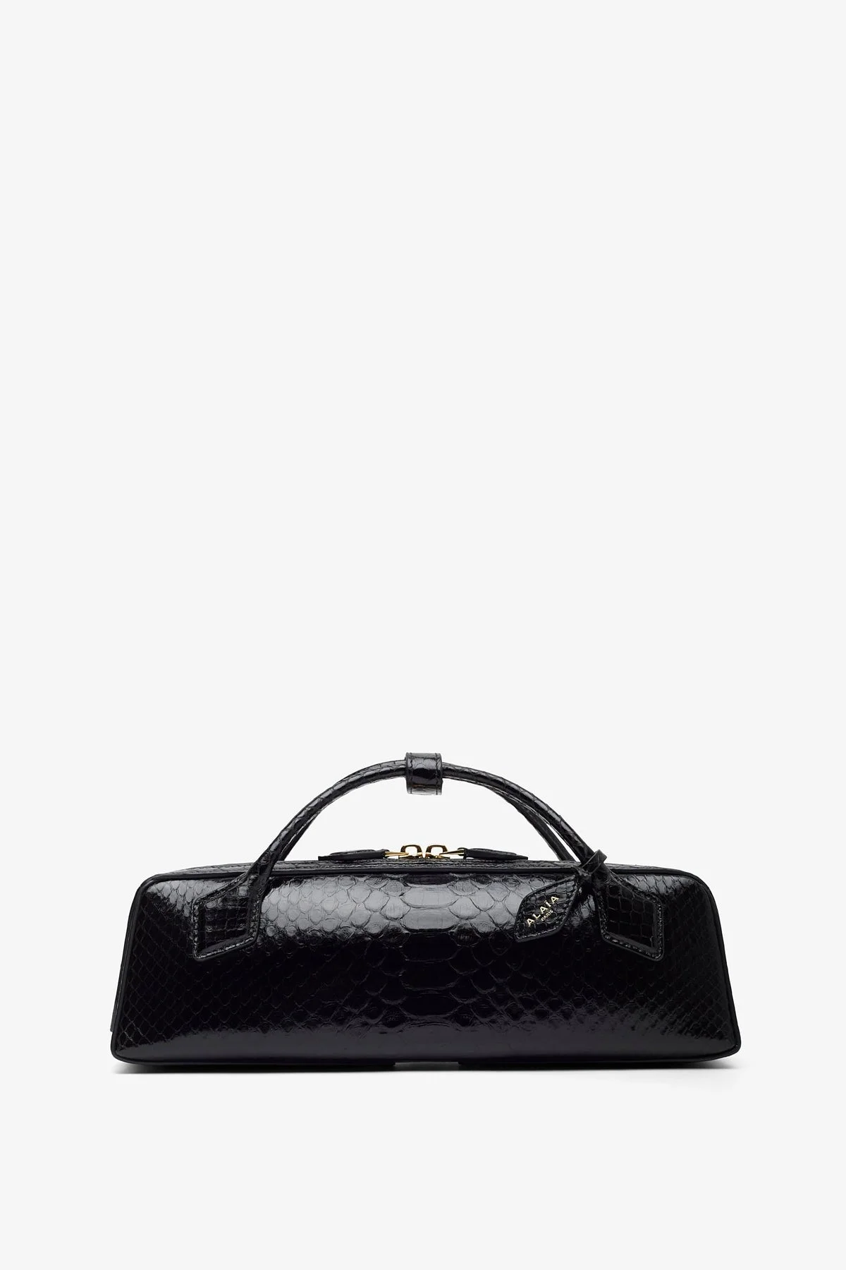 Black leather clutch bag from Alaia. The Le Teckel clutch bag is made in black python leather with elongated shape, tubular short handles with decorative ties, a double zip closure and small removable mirror on the inside pocket. - Measurements: L31 x H10 x W7 cm - Made in Italy Product Code: AA1S06026Z045999