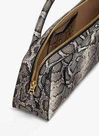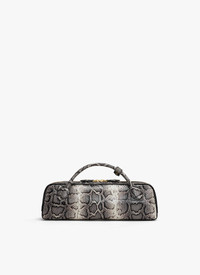 The clutch version of the emblematic Le Teckel bag Elongated shape, tubular short handles with decorative ties, double zip closure, small removable mirror on the inside pocket Hand carry Ayers snake leather, printed Dimensions (cm) : L 31 X H 10 X D 7 Made in Italy DETAILS MAIN MATERIAL : 100% HOMALOPSIS BUCCATA PRODUCT REFERENCE : AA1S06026I064-009