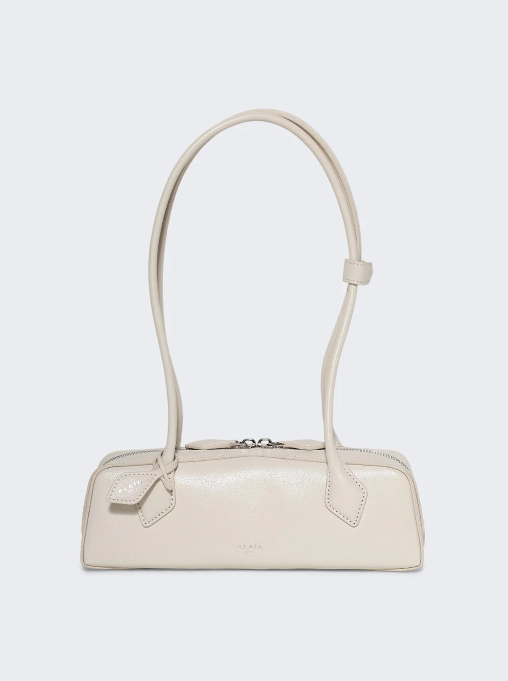 Details - Elongated shoulder bag in goatskin leather - Long tubular handles with decorative ties - Double zip closure - Small removable mirror on the inside pocket - Natural and subtle grain, shiny finish - Material: 100% Goatskin; Lining: 100% Lambskin Size Information: Vendor Color Code: Brand Style: AA1S06029CA212 Designer/Brand: ALAIA