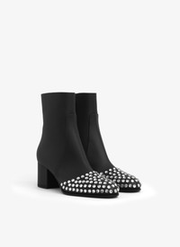 Low boots with embellished toes 60 mm square heel and tonal zip on the back Soft calfskin leather adorned with riveted strass Made in Italy DETAILS MAIN LINING: 100% LAMBSKIN MAIN APPLICATION: 100% ACRYLIC SOLE: 80% CALF LEATHER 20% RUBBER UPPER MATERIAL 1: 100% CALF LEATHER PRODUCT REFERENCE: AA3B089CK291 - 999