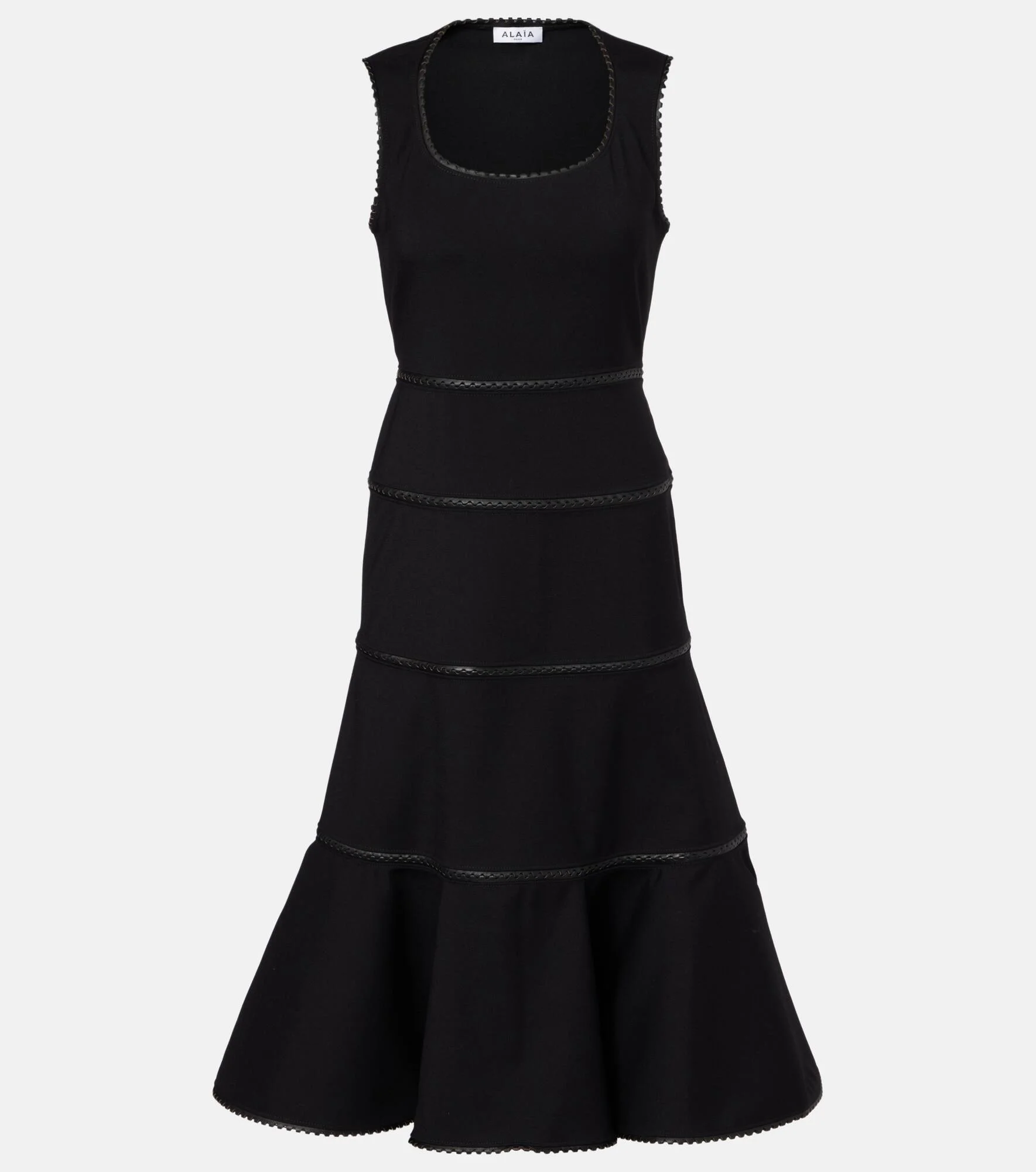 Upholding the legacy of Azzedine Alaia, the maison’s collections achieve an artful balance between sculptural and wearable. This midi dress is Italian-made from wool, and its flared silhouette is complemented by tonal leather trims. Product Details - Material: 98% wool, 2% elastane - Care instructions: specialist clean - Made in Italy - Color: black - Designer color name: Noir Alaia - Trim: 100% lamb leather - Contains non-textile parts of animal origin - Lining: 100% cotton - Closure: concealed zipped side, hook fastening - Item number: P01118710 Size & Fit - True to size - Cinched waist - Partly stretchy fabric - The model seen in the picture is 178cm-5'10" and wearing a size FR 34