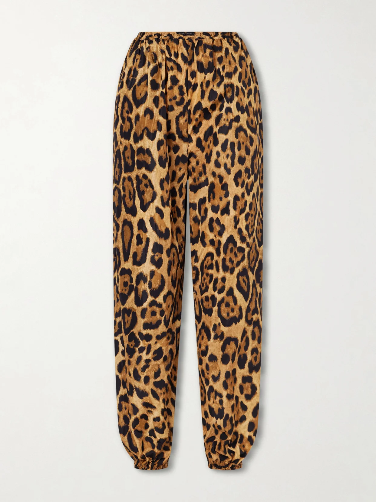 Restraint and expression converge through refined craft in Alaia Spring '26. These pants are cut from leopard-print shell with rounded legs, gathered at the waist and ankles by elasticated bands that create volume and sculptural shape.