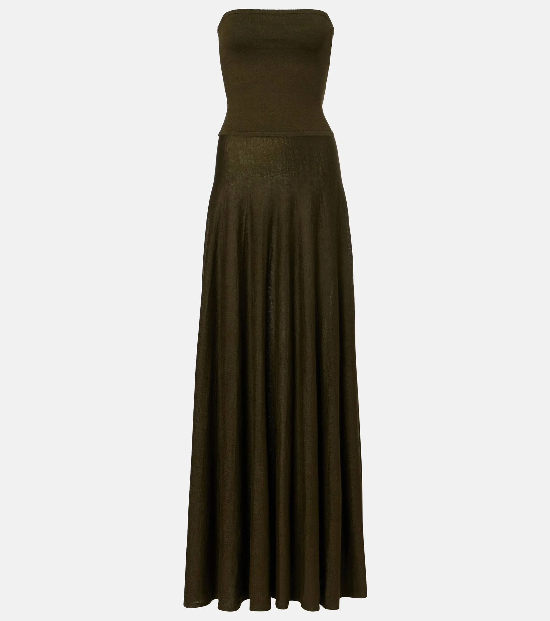 Breezy yet elegant, this flowing bustier dress from Alaia is crafted in Italy from breathable linen-blend. Designed with a flattering bustier bodice, it features a maxi length, flared skirt, and an effortlessly graceful silhouette. Product Details - Material: 90% linen, 9% polyamide, 1% polyurethane - Care instructions: specialist clean - Made in Italy - Designer color name: Olive - Item color: green - Material II: 100% linen - Elasticated waistband - Item number: P01047451 Size & Fit - Fits large to size - we recommend trying one size smaller - Strapless - Elasticated top - Fitted bodice, loose skirt - Partly stretchy fabric - The model seen in the picture is 178cm-5'10" and wearing a size FR 34