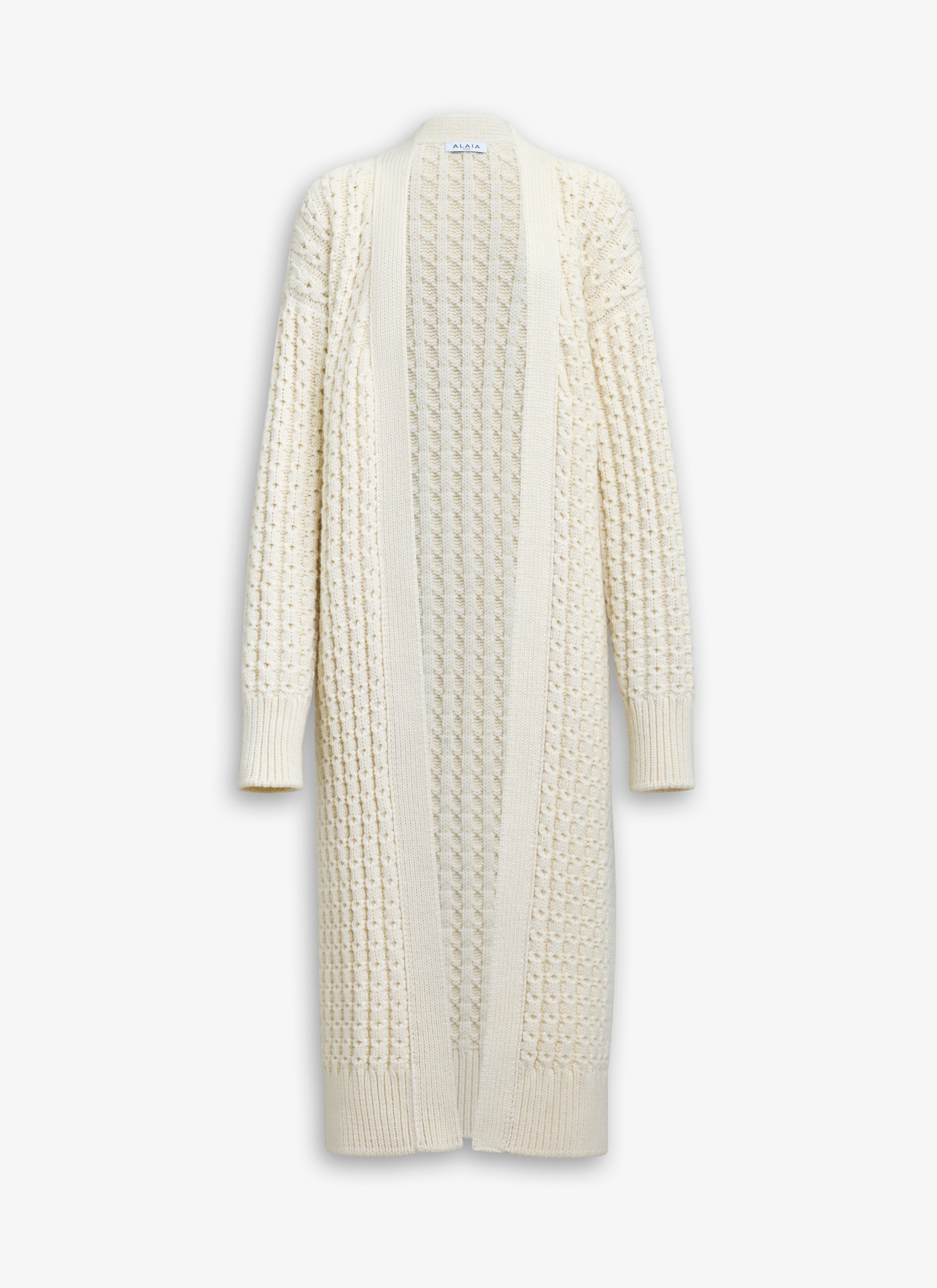 Long textured knit cardigan Relaxed fit Shawl collar, long sleeves, honeycomb effect, ribbed hems, matching belt Made in Italy DETAILS COMPOSITION: 100% WOOL PRODUCT REFERENCE: AA9M1040K027A - 030