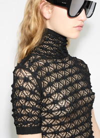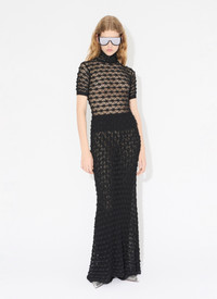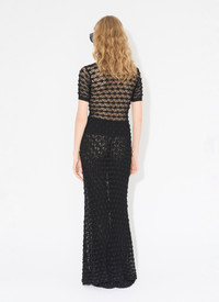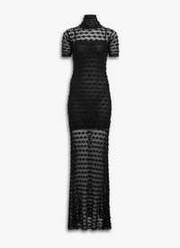 Long dress in a geometric lace knit Fitted bodice and flared skirt Short sleeves, high collar, three-dimensional dotted knit Optional lining, two ways to style Made in Italy DETAILS COMPOSITION: 87% VISCOSE, 10% POLYAMIDE, 3% POLYESTER LINING: 100% VISCOSE PRODUCT REFERENCE: AA9R2532K002A - 995