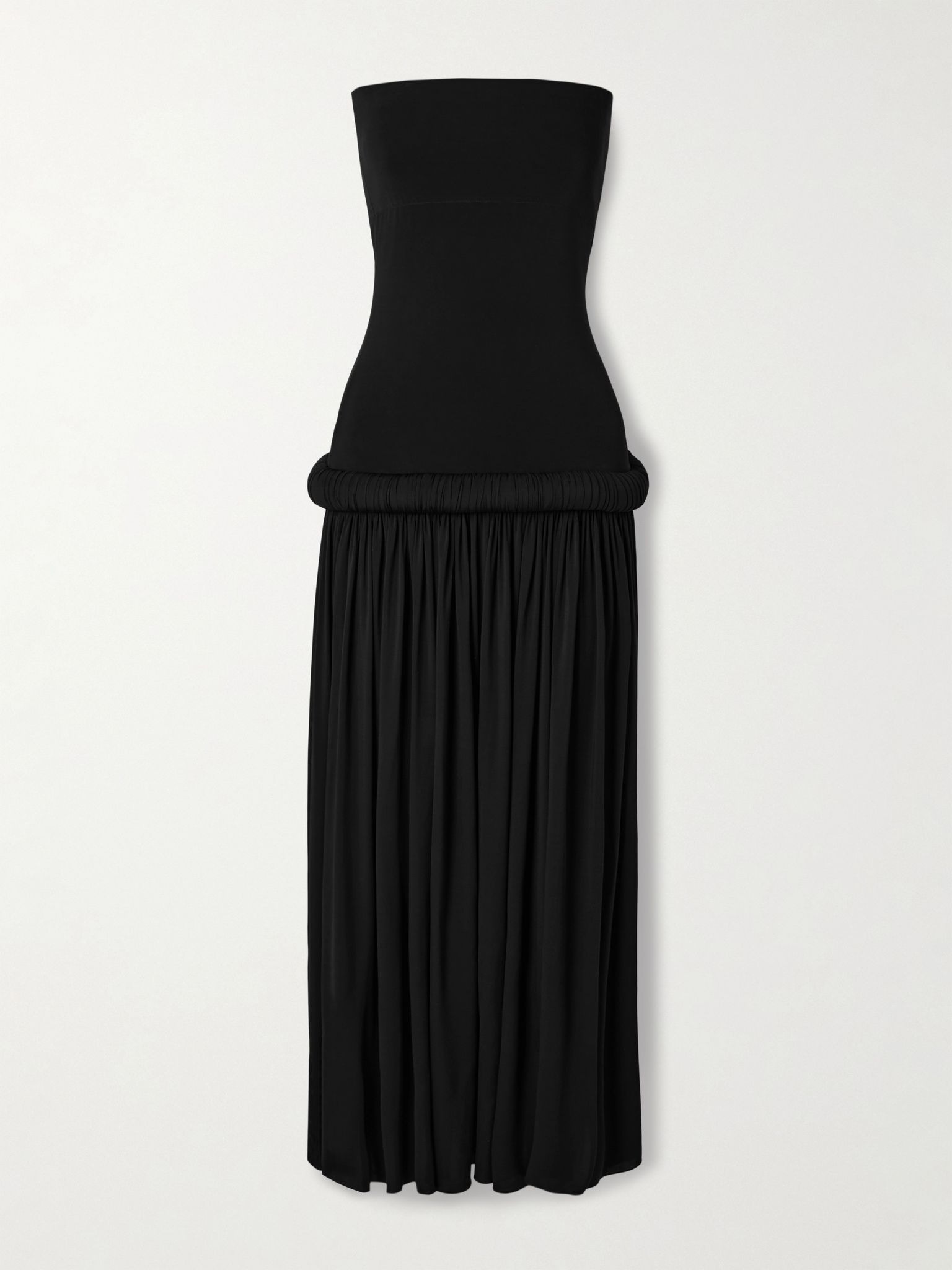 Cut from stretch-jersey, Alaia’s midi dress has a close-fitting strapless bodice with a twisted dropped waist and a floaty pleated skirt. Wear it with the house's boots or sculptural heels. Details & Care - Black stretch-jersey - Slips on - Fabric1: 96% viscose, 4% elastane; fabric2: 48% viscose, 33% polyamide, 10% polyester, 9% elastane