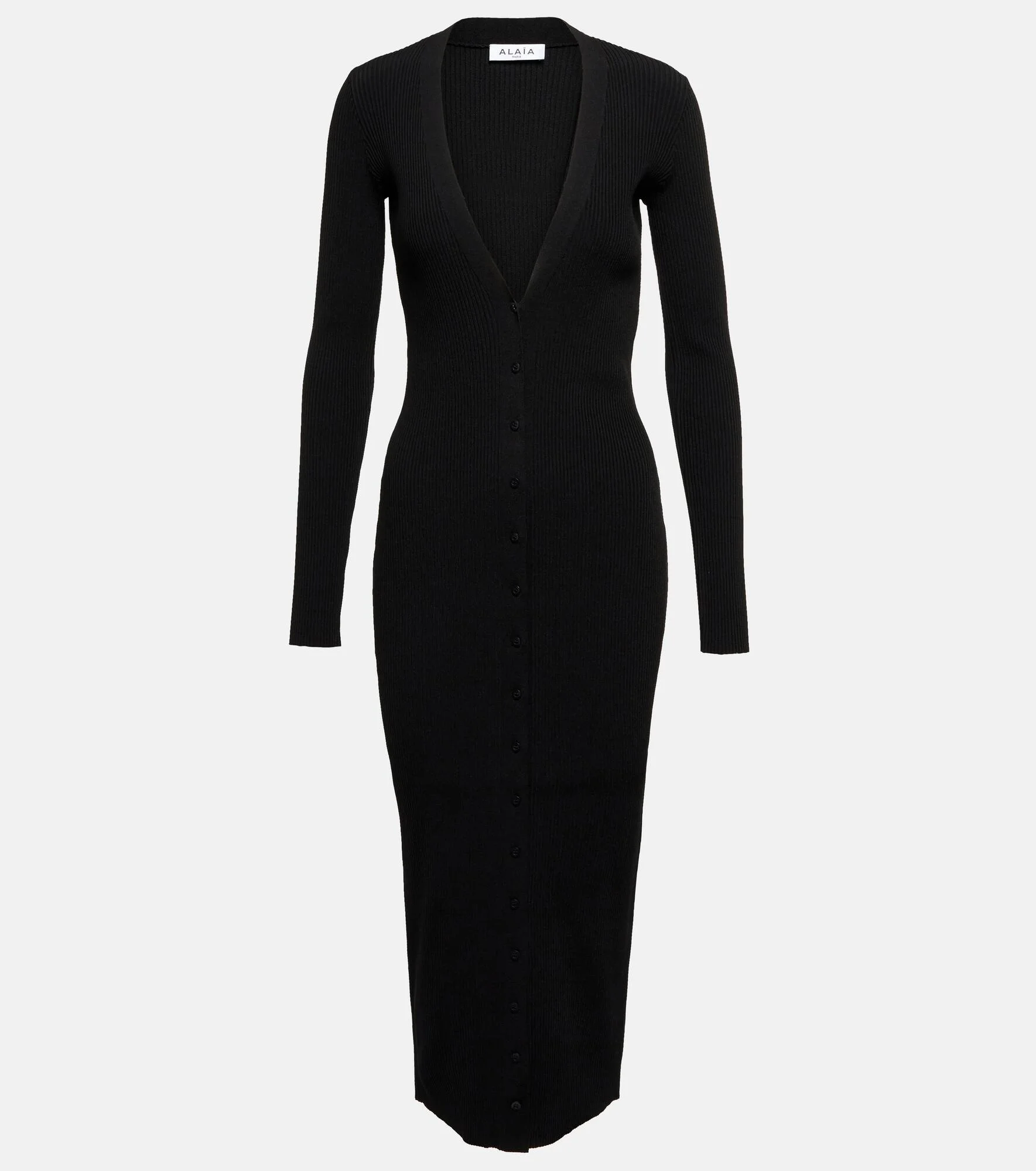 This long-sleeved midi dress from Alaïa is shaped with a plunging V neckline. - material: 83% viscose, 17% polyester - care instructions: dry clean - buttoned front - Made in Italy - Designer colour name: Noir Alaia size & fit - True to size - Straight fit - Mid-weight material - The model seen in the picture is 178cm-5'10" and wearing a size FR 36