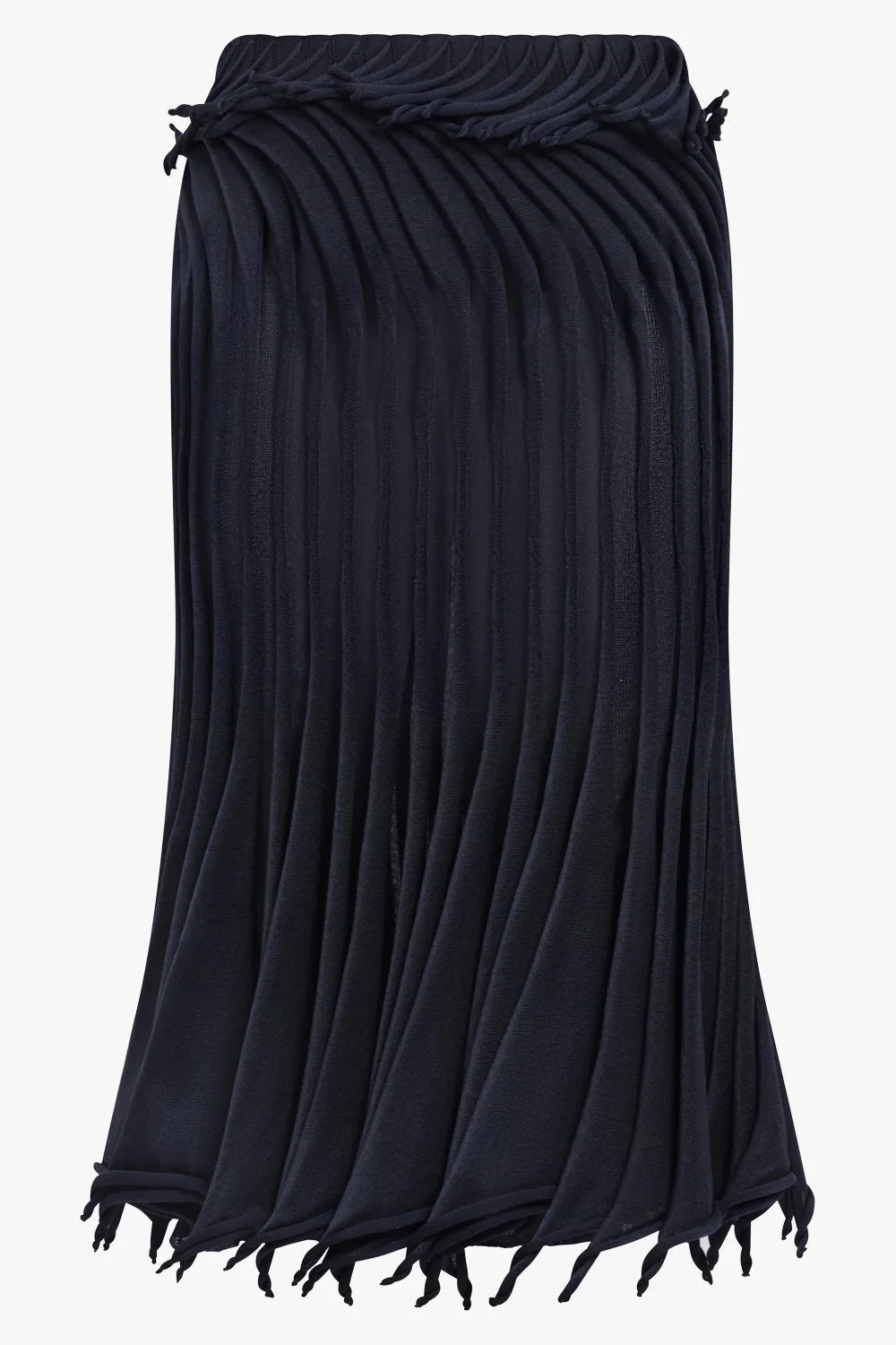 This striking Alaia Low‑Waist 3D Pleat Skirt exemplifies the maison’s sculptural finesse and forward-thinking knit innovation. Crafted from semi-sheer Japanese nylon yarn formed into dramatic 3-D fins, the piece features a low-slung waistline with an elastic band for comfort, a discreet side zip for ease of wear, and a knee-length silhouette that glides with layered movement. The gradient effect and textured fins give the design a fluid, architectural feel—perfect for the modern wardrobe. - Fabrication: 100% Nylon - Low-waist silhouette with elasticised waistband - Voluminous pleated fins structure with 3-D protruding layers - Side zip closure for a seamless fit - Knee-length for elevated versatility - Midnight colourway with subtle gradient detailing Style with a clean minimalist top or the matching Layered Sleeveless 3D Pleat Top. Size and Fit Tiah: Model is 178cm/5’9” and is wearing a size FR38 Model Measurements: Bust: 86cm, Waist: 69cm, Hips 90.5cm Fits true to size