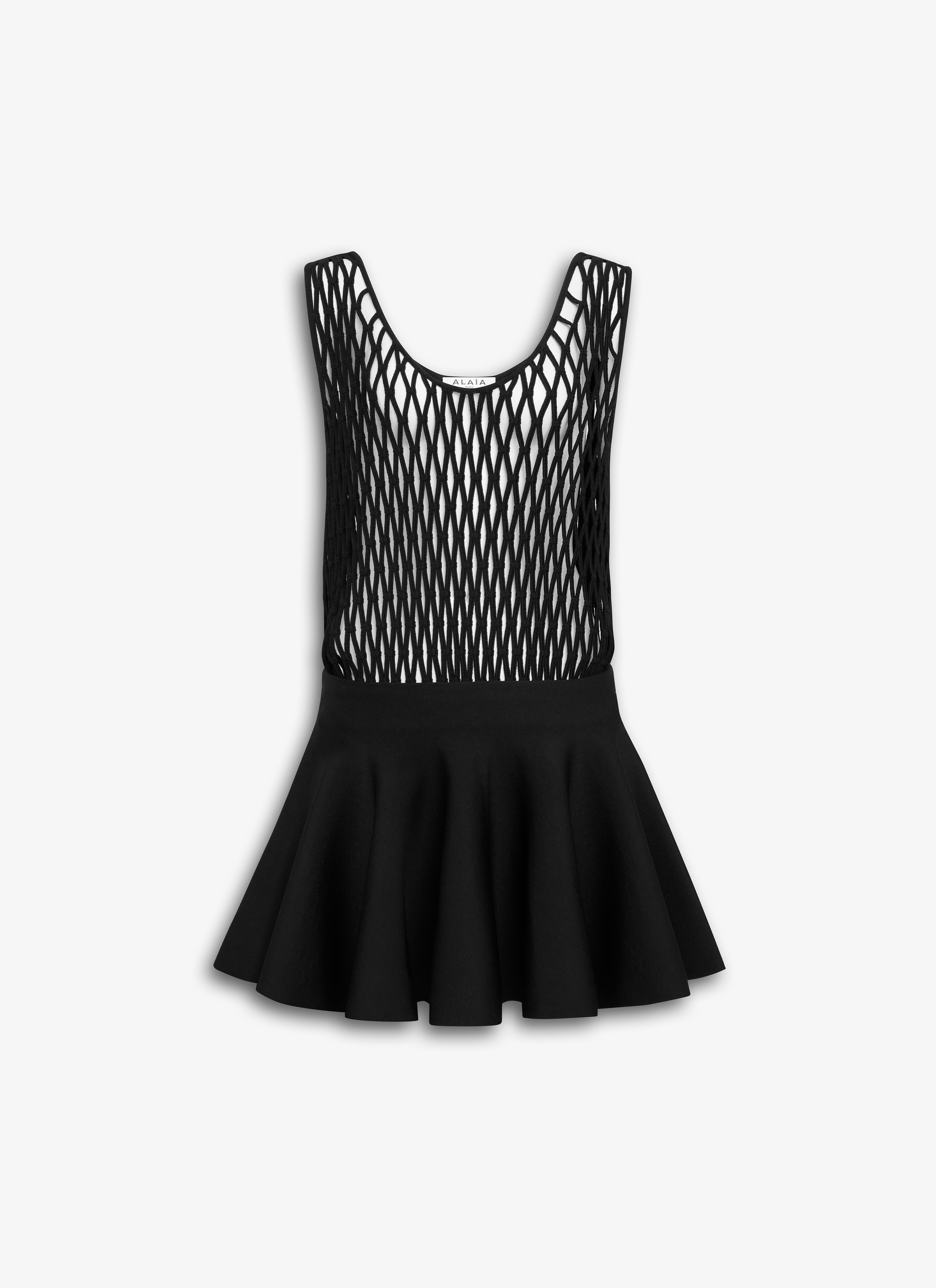 Skater dress in macrame knit Loose sleeveless macrame top, scoop neck, plain bottom skirt Made in Italy DETAILS SKIRT: 75% VISCOSE 25% POLYESTER TOP: 66% VISCOSE 24% POLYESTER 7% LINEN 2% POLYAMIDE 1% ELASTANE PRODUCT REFERENCE: AA9R2629K003A - 995