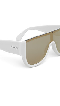 DETAILS Wide squared eye mask Alaia signature on the temples Recycled acetate Made in Italy MATERIALS Highlights MAIN MATERIAL: 100% ACETATE FIBER PRODUCT REFERENCE: AA4L0086S001 - 073