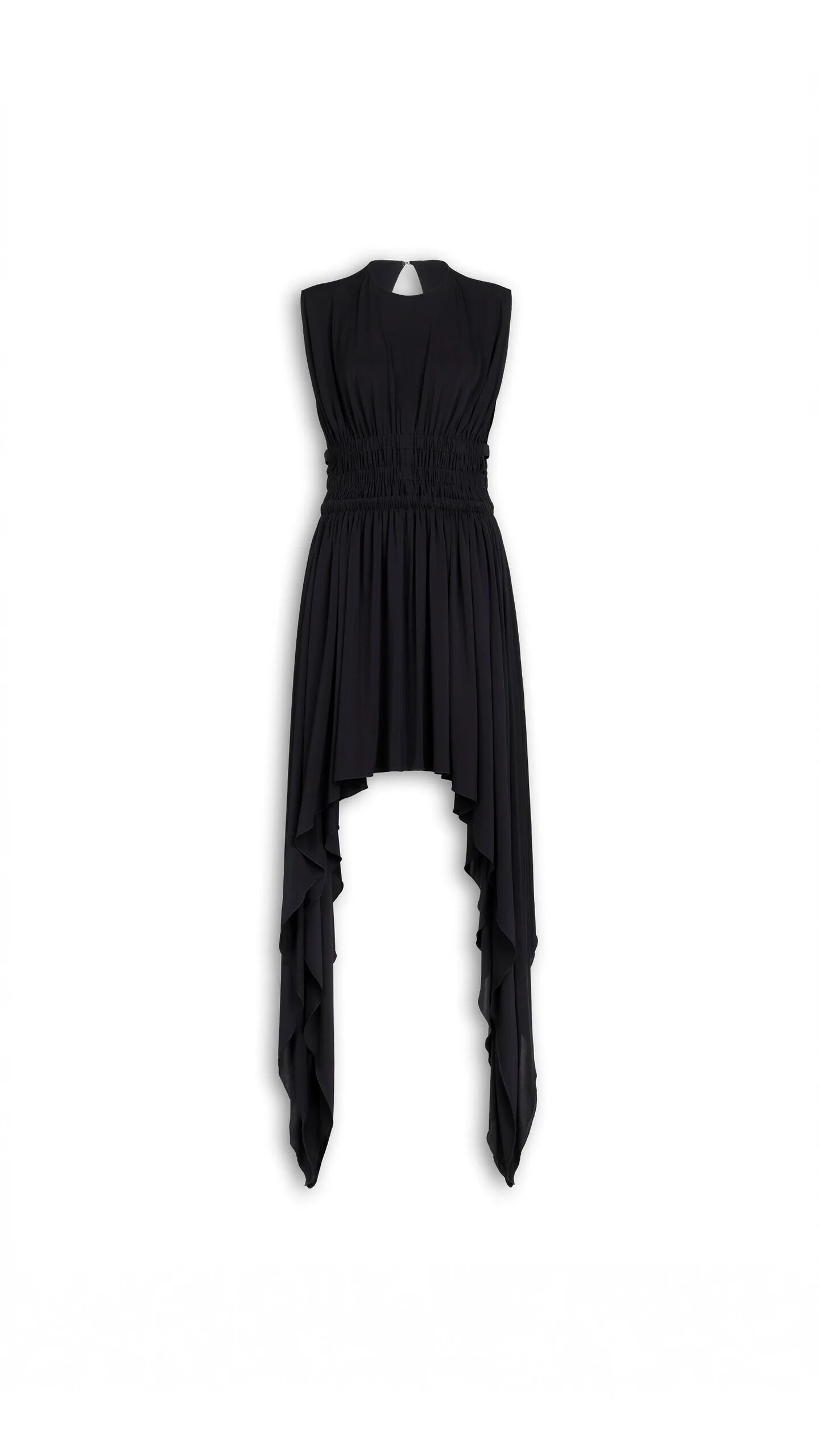 DETAILS Deesse dress in fluid jersey Crew neckline, sleeveless Three elasticated bands on the sides, one clasp in the back of the neck, curved pleated hemline, raw edge Asymmetrical length Softly cinched cut Made in Italy MATERIALS MAIN MATERIAL: 100% VISCOSE PRODUCT REFERENCE: AA9R3041J090C-995