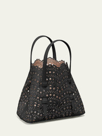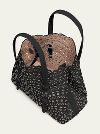ALAIA "Mina" mini tote bag in cutout design appliques leather. Flat top handles loop through sides of bag. Adjustable shoulder strap. Open top. Interior, slip pocket. Leather lining. Feet protect bottom of bag. 7.9"H x 9.8"W x 4.3"D. Made in France. Online Inquiries: BGS21_V6MP1| Store Inquiries: #3585834