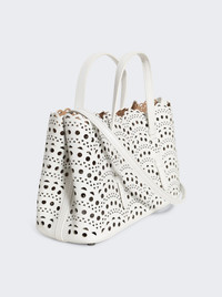 Details - Cut-out leather tote bag in a lace-inspired Vienne motif - Expandable side gussets with snap fastenings - Galvanized silver hardware - Leather pouch - Detachable shoulder strap - Material: Calf Leather Size Information: Vendor Color Code: Brand Style: AA1S06726C0A44 Designer/Brand: ALAIA
