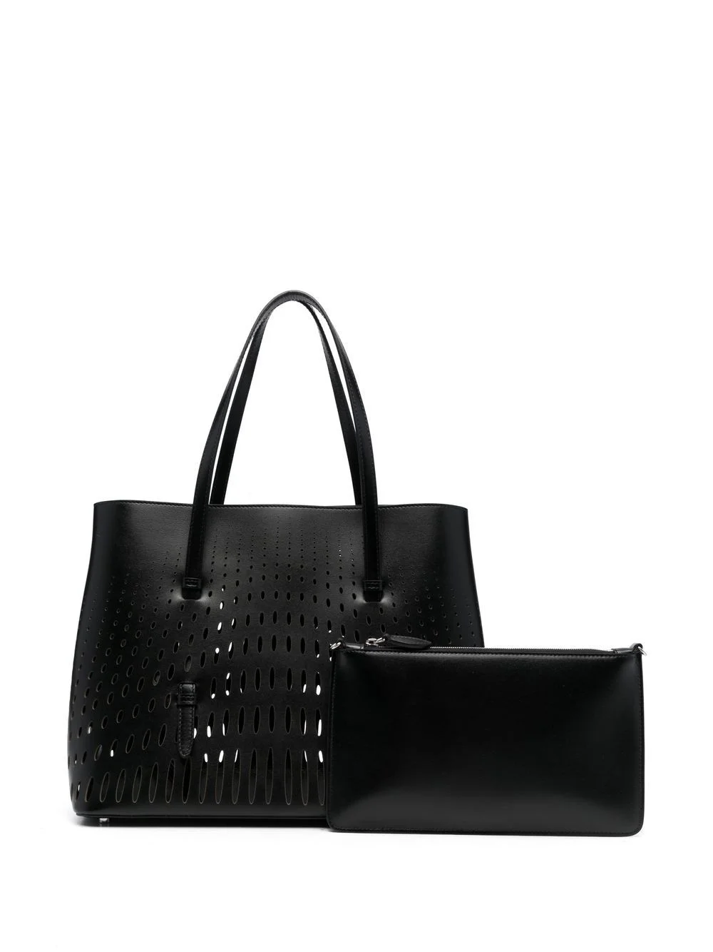 Mina laser-cut tote bag black calf leather laser-cut detail two long top handles main compartment Made in Italy Composition Outer: Calf Leather 100% SIZE & FIT Model measurements Height 5 ft 10 in(1.77 m) Bust/Chest 35.03 in(89 cm) Hips 35.03 in(89 cm) Waist 23.62 in(60 cm) Measurement DEPTH 5.9 in(15 cm) HANDLE 6.69 in(17 cm) HEIGHT 9.84 in(25 cm) WIDTH 12.59 in(32 cm)