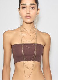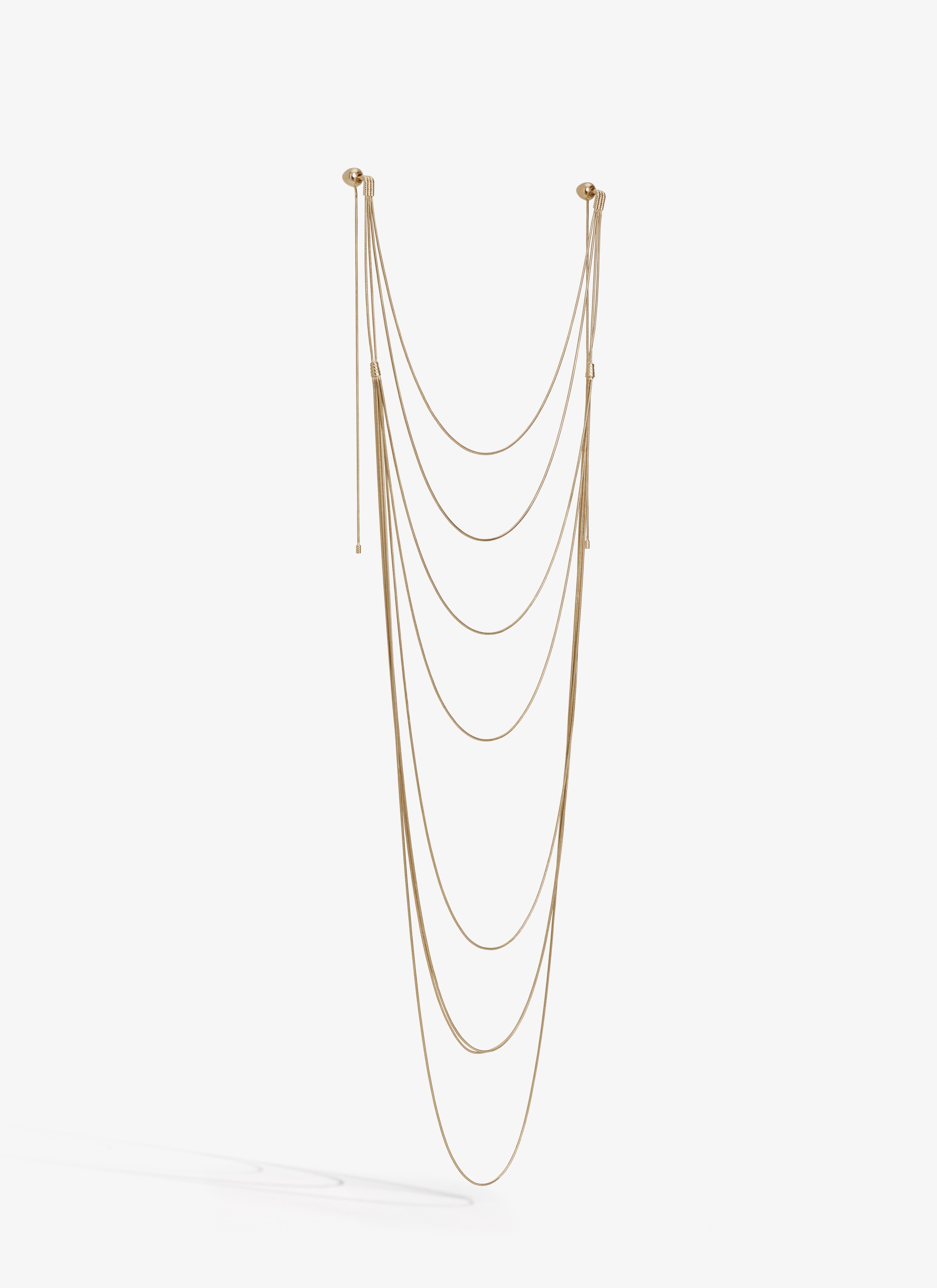 Earrings made from multiple chains going around the neck from ear to ear into a necklace Brass with gold finish Largest chain length : 53 cm Earring clasp length : 17 cm Made in Italy DETAILS MAIN MATERIAL: 100% BRASS PRODUCT REFERENCE: AA2B146LA006 - 231