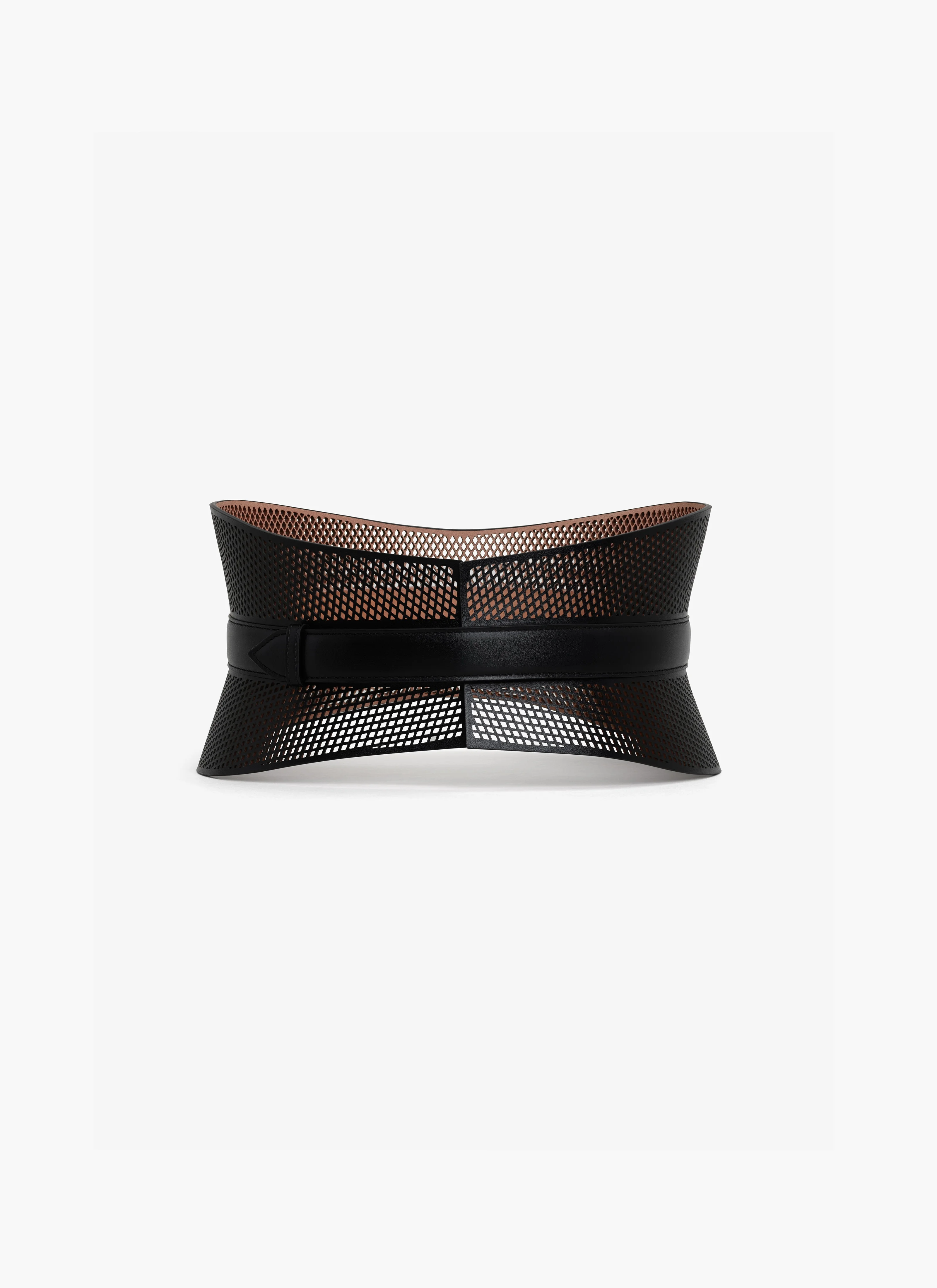 Modern corset belt A signature Alaia accessory shaped to adjust the waist perfectly Perforated calfskin leather with a fishnet pattern Dimensions (cm) : H 13,5 Made in Italy DETAILS MAIN MATERIAL: 100% CALFSKIN LEATHER SECONDARY MATERIAL: 100% CALFSKIN LEATHER PRODUCT REFERENCE: AA1C043GCA330 - 999