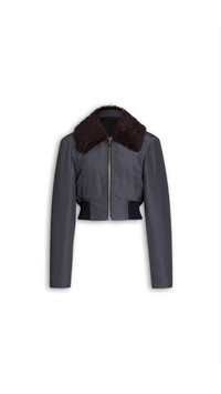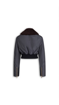 DETAILS Aviator bomber jacket in textured nylon with collar in shearling Rounded, cropped silhouette with ribbed hem Set-in sleeves with zipped cuffs Gold hardware zip, center back seam Made in Italy MATERIALS Highlights MAIN MATERIAL: 71% POLYAMIDE 29% WOOL RIBBING: 93% VIRGIN WOOL, 4% POLYAMIDE, 3% ELASTANE COLLAR: 100% LAMBSKIN LEATHER LINING: 100% POLYAMIDE PRODUCT REFERENCE: AA9V1237W120C-840