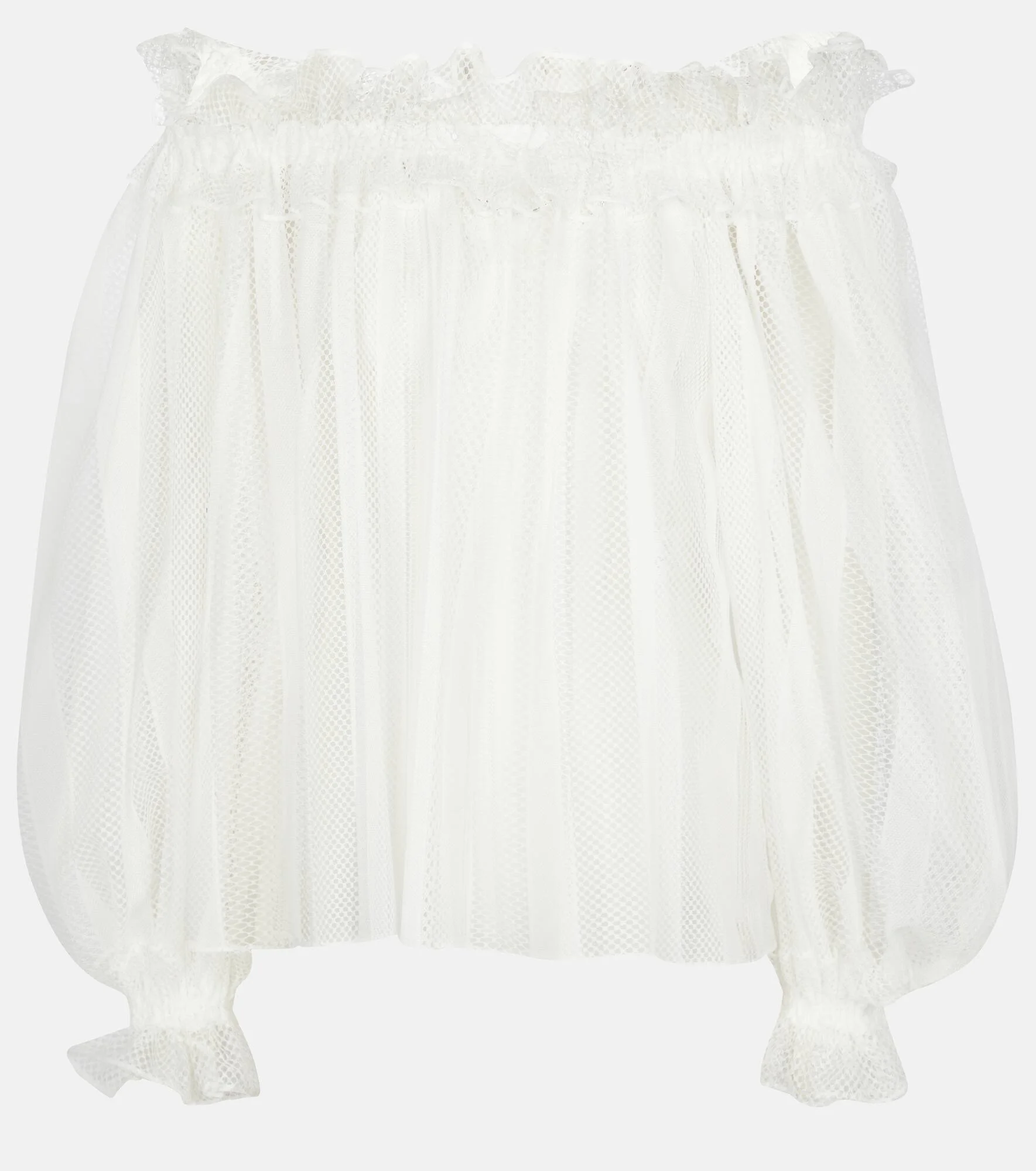 This white Alaïa blouse is made entirely from paneled lace-like mesh that creates a subtle, sheer effect. The peasant-style silhouette sits off the shoulders with blouson sleeves and ruffle trims. Wear yours with the house's corset belts. Product Details - Made in Italy - Care instructions: dry clean - Elasticated cuffs - Designer color name: Blanc - Material: 100% polyester - Item number: P00572946 Size & Fit - True to size - Off-the-shoulder - Semi-sheer - Designed for a loose fit - Lightweight material - Falls to the hip - The model seen in the picture is 178cm-5'10" and wearing a size FR 36