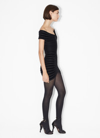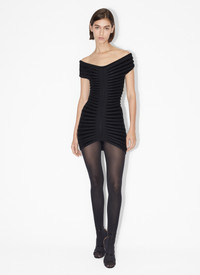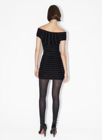 Off-shoulder mini tube dress, 3D velvet skeleton, chenille yarn is used in combination with a lustrous stretch viscose. Made in Italy DETAILS COMPOSITION: 63% VISCOSE, 37% POLYAMIDE COLLAR: 57% VISCOSE, 42% POLYAMIDE, 1% POLYURETHANE PRODUCT REFERENCE: AA9R23083M750 - 995