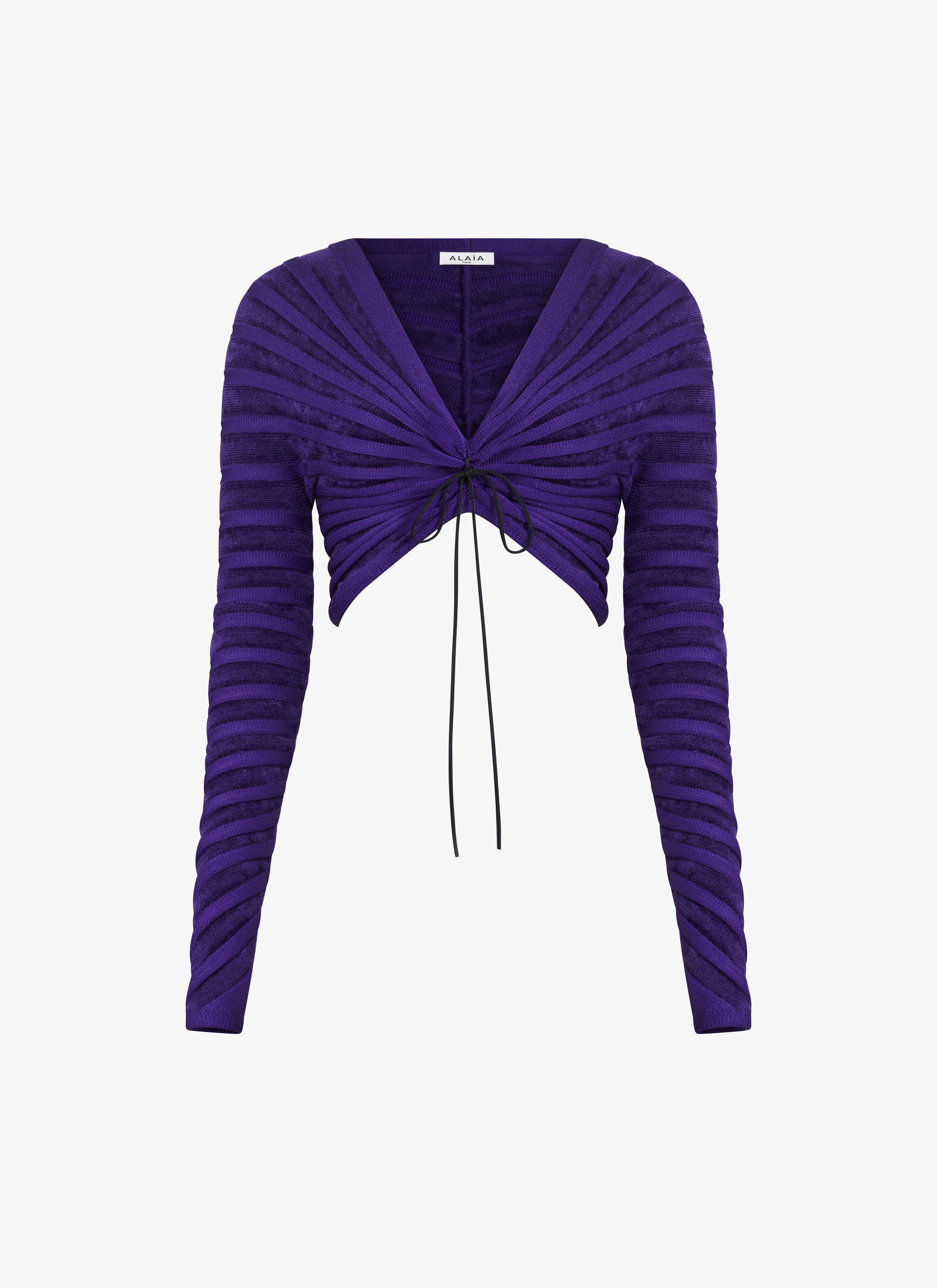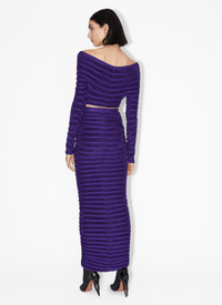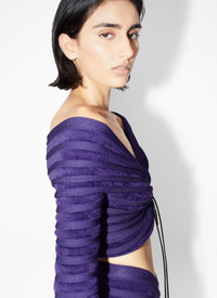 Long sleeves off-the-shoulder 3D velvet skeleton crop top, adjustable drawstring, chenille yarn is used in combination with a lustrous stretch viscose. Made in Italy DETAILS COMPOSITION: 63% VISCOSE, 37% POLYAMIDE ADDITIONAL MATERIAL: 75% VISCOSE, 24% POLYAMIDE, 1% POLYURETHANE MESH: 83% VISCOSE, 17% POLYAMIDE PRODUCT REFERENCE: AA9H10493M750 - 495