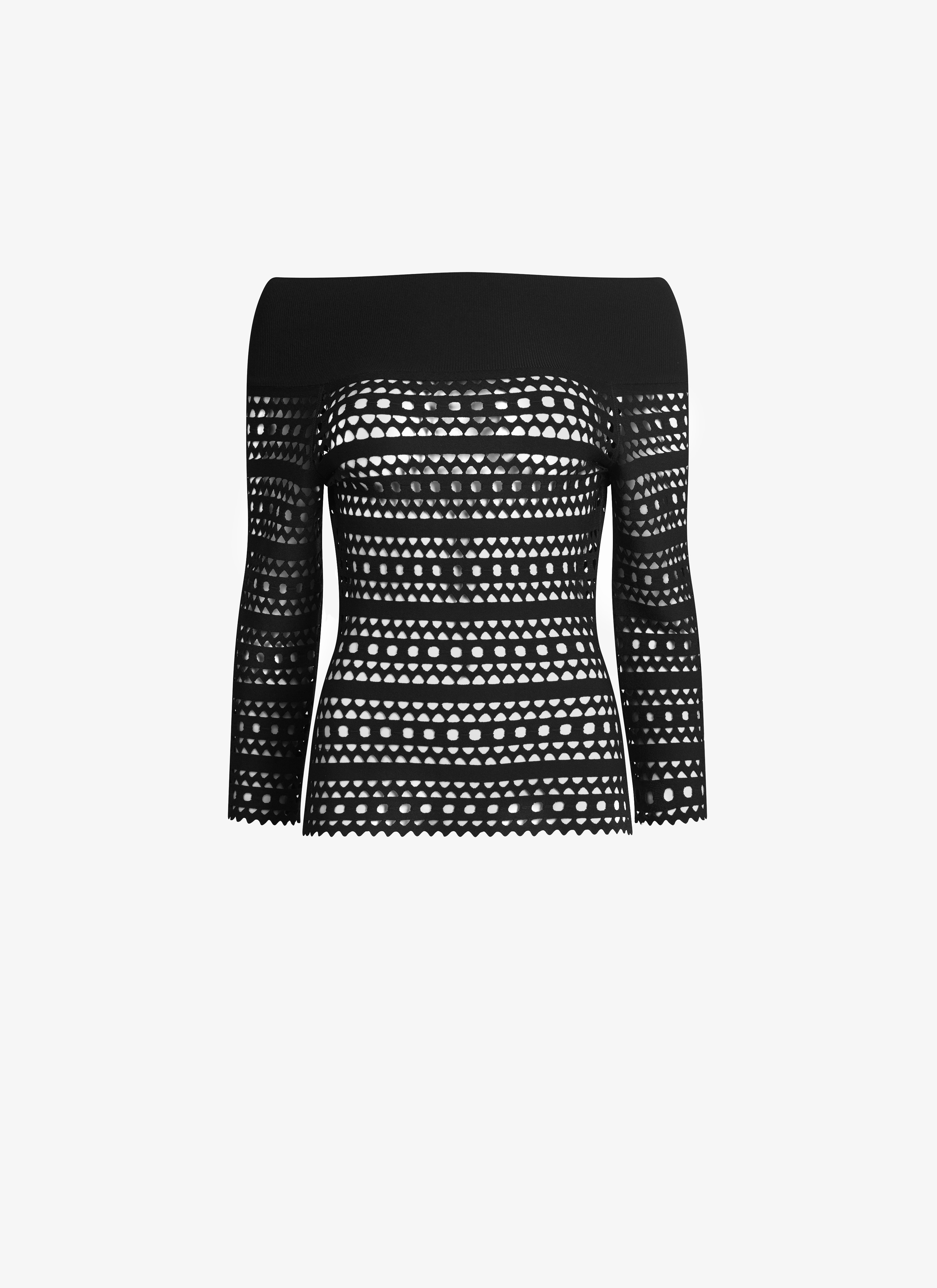 Long sleeves off-shoulder top, knitted in perforated Vienne, re-interpretation of the Alaïa vienne technique. Made in Italy DETAILS COMPOSITION: 75% VISCOSE, 25% POLYESTER COLLAR: 65% VISCOSE, 22% POLYESTER, 10% POLYAMIDE, 3% ELASTANE PRODUCT REFERENCE: AA9H10633M774 - 995