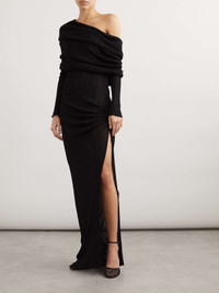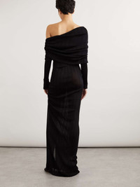 EDITORS'NOTES Alaïa's maxi dress is alluring and elegant, just as you'd expect from the brand. Made from pointelle-knit for a relaxed fit, it has a draped panel that folds over the bodice and creates a shoulder-baring neckline. The dramatic split reveals plenty of leg. Temper the sheerness with tonal underwear. SIZE & FIT - Fits true to size, take your normal size - Designed for a relaxed fit - Lightweight knit - Model is 175cm/ 5'9" and is wearing a FR 34 DETAILS & CARE - Black pointelle-knit - 100% viscose