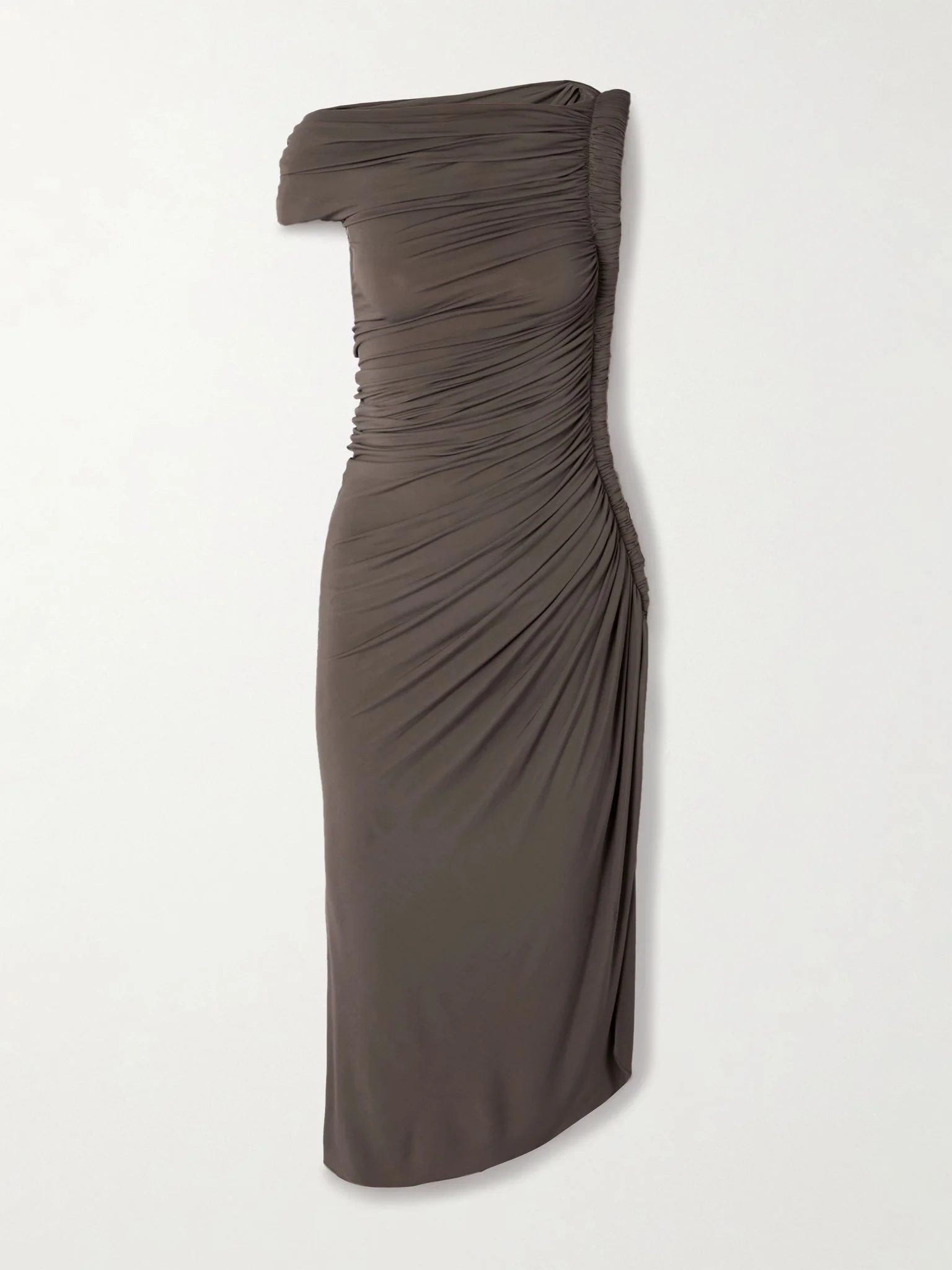 The female form is always the starting point for Alaia’s design team. This midi dress is draped from stretch-jersey in an elegant one-shoulder profile with a sculptural, gathered tube on one side. Wear yours with opaque tights and pumps. Details & Care - Taupe stretch-jersey - Slips on - 96% viscose, 4% elastane