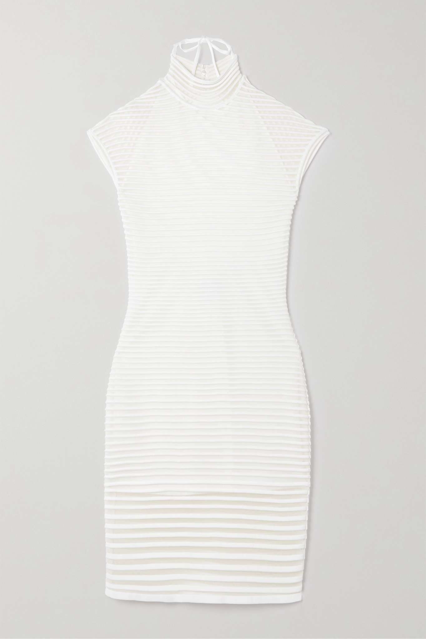 EDITORS'NOTES If you're looking to embrace this season's sheer styles, go all in with Alaïa's mini dress. It's rib-knitted to contour your curves, with see-through stripes that get closer together towards the waist for the illusion of an hourglass silhouette. Frame the high neckline with statement earrings. SIZE & FIT - Fits true to size, take your normal size - Intended for a close fit - Designed with a slim-fitting slip - Fine knit - Model is 180cm/ 5’11” and is wearing a FR 36 DETAILS & CARE - White ribbed-knit - Ties and concealed button fastenings at neck - 77% viscose, 16% polyester, 7% silk; lining: 100% viscose