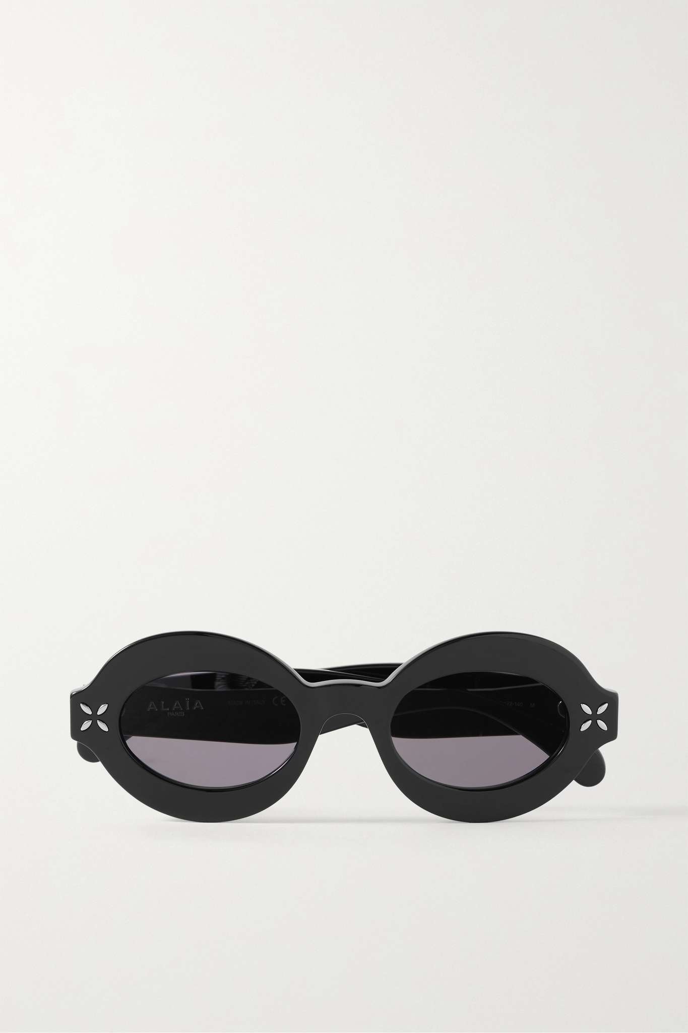 EDITORS'NOTES Alaïa's sunglasses have subtle silver-tone details at the temples that call to mind the signature perforated pattern seen throughout the label's accessories. They're made from glossy black acetate in an oval shape and have wide arms and gray lenses. Keep yours in the case to prevent scratches between wears. DETAILS & CARE - Black acetate - Come with a case - 100% UV protection