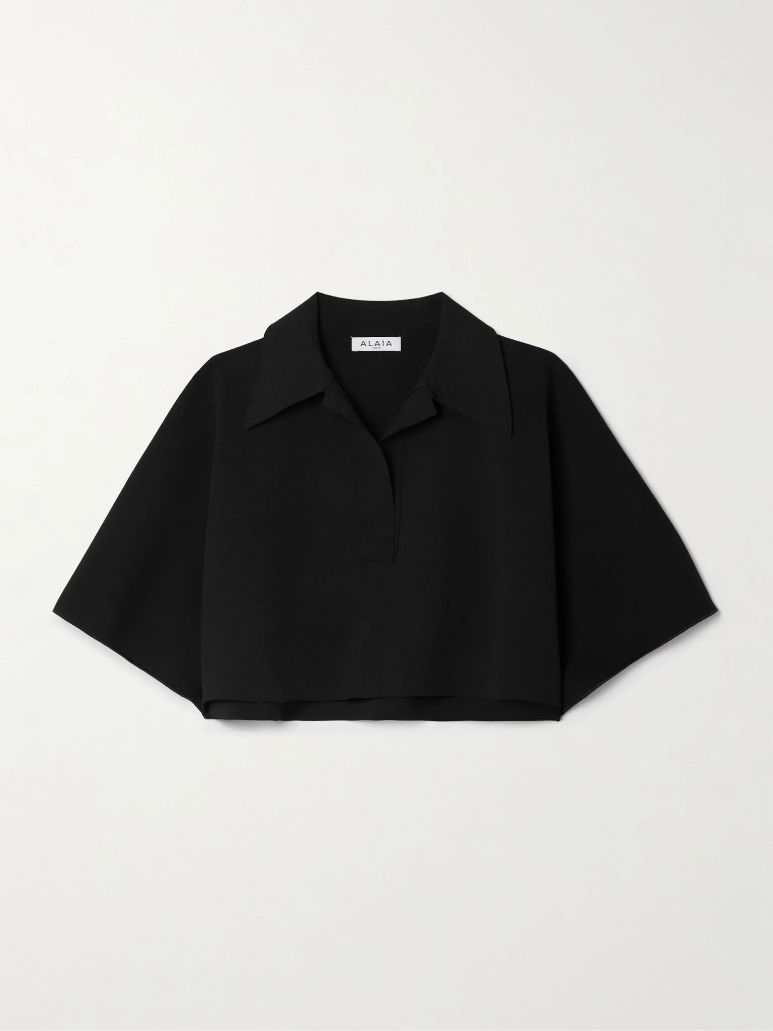 Alaia's polo shirt is designed for an oversized, loose fit with dropped shoulders and wide sleeves that add to the slouchy shape. It's knitted for a soft, smooth texture with a sharp collar and an ultra-cropped hem that calls for high-waisted skirts or pants. Details & Care - Black knit - Slips on - 79% viscose, 14% polyamide, 5% polyester, 2% elastane