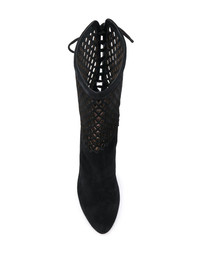 panelled kitten heel ankle boots Black calfskin suede panelled kitten heel ankle boots from Alaia featuring a pointed toe, a perforated detail, a mesh upper, a back tie fastening, a leather sole and a tapered heel. Made in Italy Composition Outer: Calf Leather 100% Lining: Calf Leather 100% Sole: Calf Leather 100% SIZE & FIT Measurement CIRCUMFERENCE 12.2 in(31 cm) HEEL 3.14 in(8 cm) HEIGHT 9.05 in(23 cm)