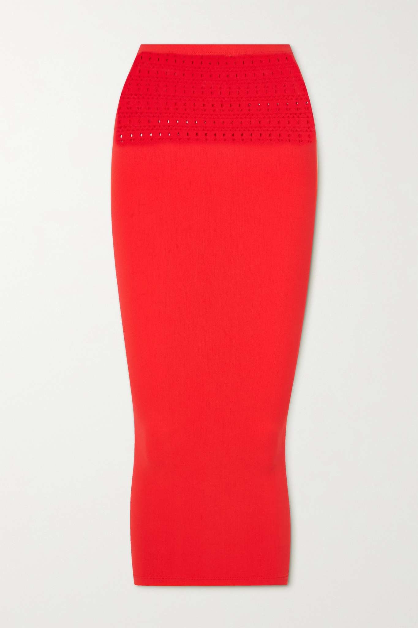 EDITORS'NOTES Alaïa's midi skirt is cut from springy pointelle-knit that hugs your curves but doesn't cling. It makes an elegant choice for the beach or poolside drinks - wear it over a swimsuit with the matching cropped cardigan. SIZE & FIT - Fits true to size, take your normal size - Take the next size up if you wish to achieve a looser fit - Midi-length, designed to be worn at the waist - Mid-weight, stretchy fabric - Model is 177cm/ 5'10" and is wearing a FR 36 DETAILS & CARE - Scarlet pointelle-knit - Slips on - 82% nylon, 18% elastane