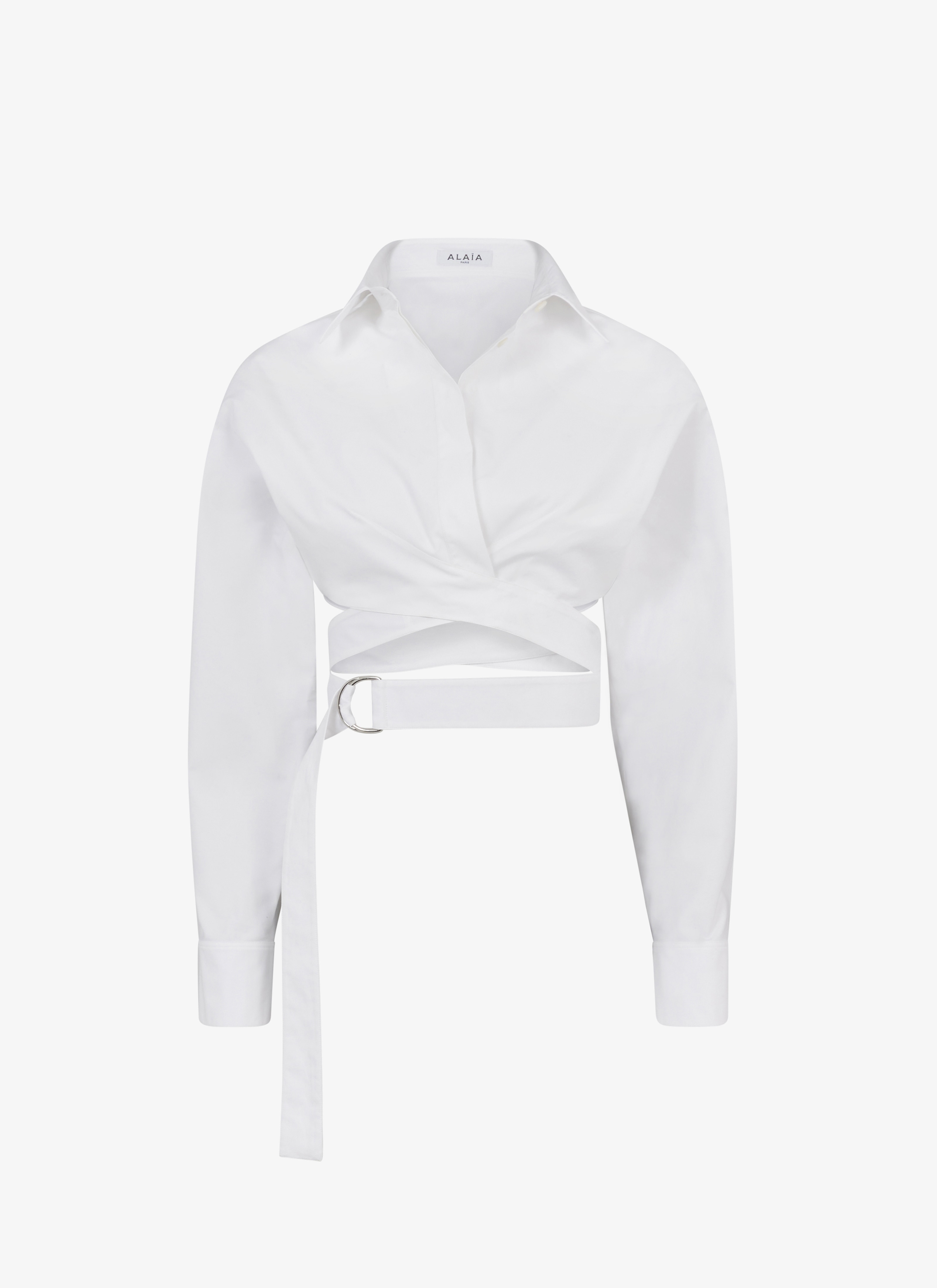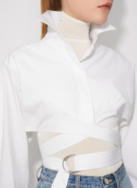 Cross over shirt Classic shirt collar Buckle fastenning around the waist Cropped fit Made from cotton poplin Made in Italy DETAILS COMPOSITION: 100% COTTON PRODUCT REFERENCE: AA9C09056T611 - 000