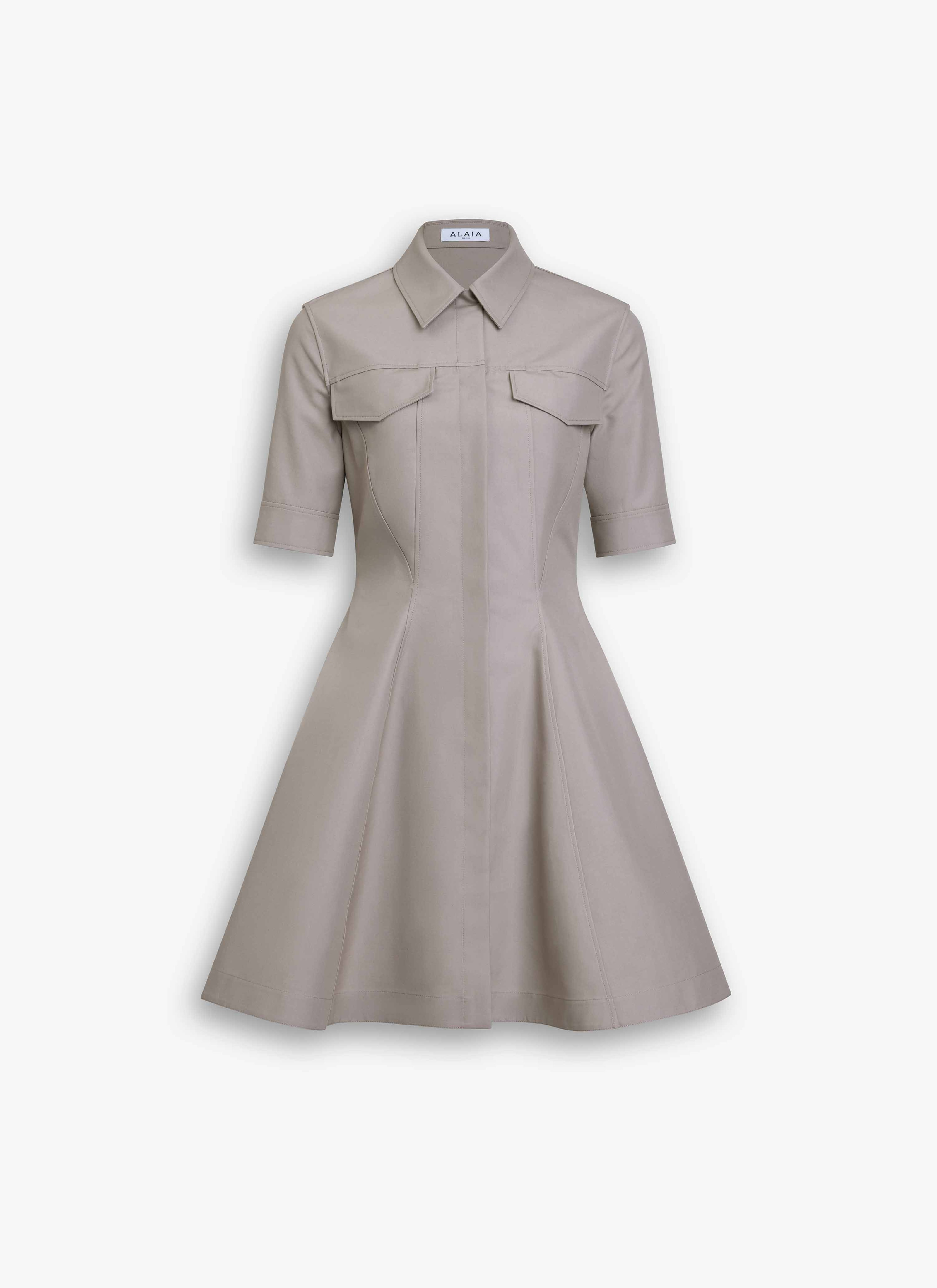 Skater shirt dress in double poplin Short sleeves with buttoned cuffs, pointed collar, flap chest pockets Sculpted waistline, flared skirt, midi length Tailored fit Made in Italy DETAILS MAIN MATERIAL : 100% COTTON PRODUCT REFERENCE : AA9R2721T447B - 809