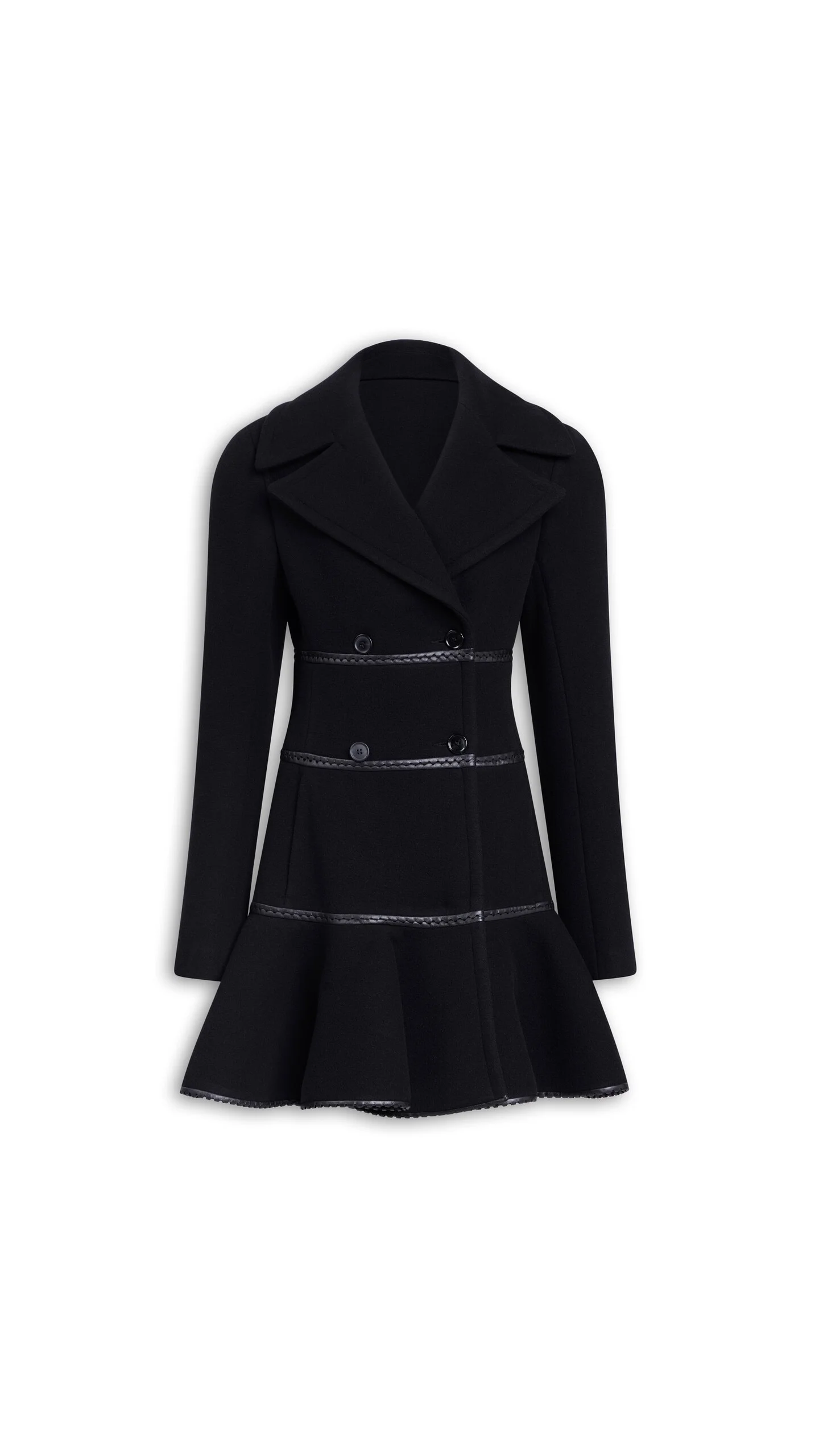 DETAILS Single breasted charniere coat in double face wool Fitted cut, thigh length, front pockets Drop sleeves Peplum hem line, horizontal leather panels Made in Italy MATERIALS MAIN MATERIAL: 100% VIRGIN WOOL POCKET LINING: 100% COTTON LINING: 100% CUPRO PRODUCT REFERENCE: AA9M1138T473C-995
