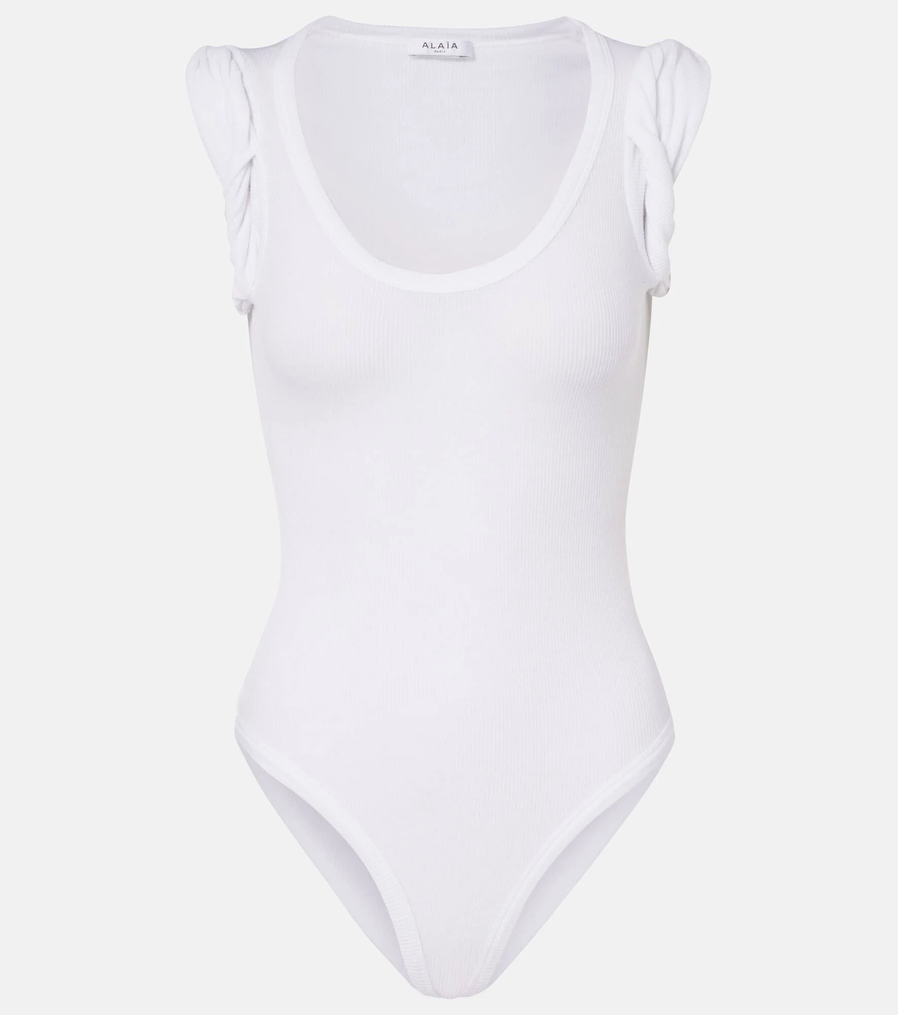 Upholding the legacy of Azzedine Alaia, the maison’s collections achieve an artful balance between sculptural and wearable. This bodysuit is made from ribbed-knit fabric with crease-detailing at the shoulders. Product Details - Material: 83% modal, 10% cashmere, 7% elastane - Care instructions: dry clean - Made in Italy - Color: white - Designer color name: Blanc - Closure: snap-buttoned fastenings - Cuff: turnback - Item number: P01166132 Size & Fit - True to size - Sheer - Fitted - Stretchy fabric - High-cut leg - Height of model is 174cm-68.5" and wears a size FR 34