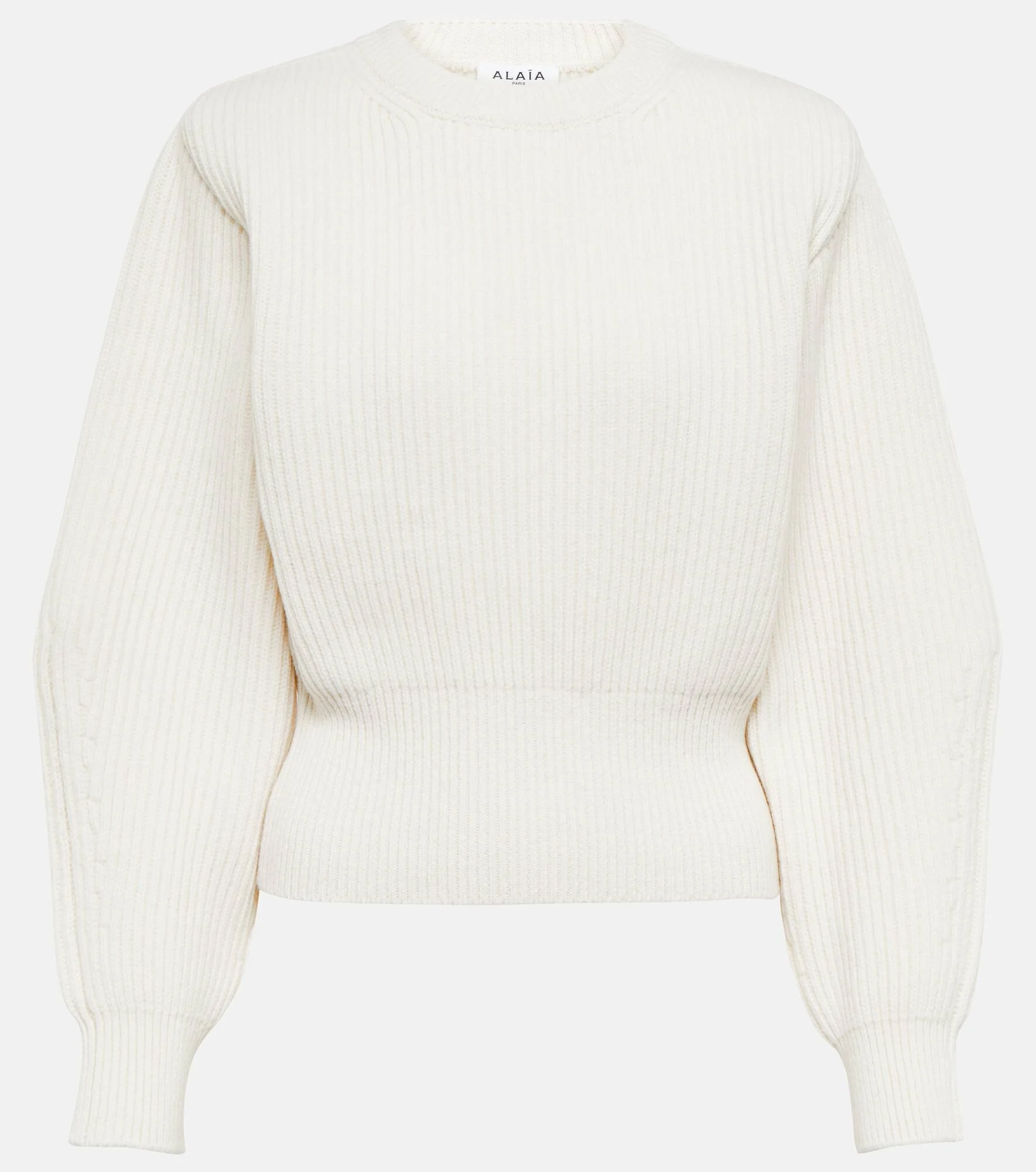 Made from a ribbed wool and cashmere knit, this sweater from Alaia has a crewneck and wide sleeves. Product Details - Material: 92% wool, 8% cashmere - Care instructions: do not wash - Made in Italy - Designer color name: Blanc Casse - Item number: P00700927 Size & Fit - True to size - Shoulder pad inserts - Cinched waist - Slightly cropped - The model seen in the picture is 178cm-5'10" and wearing a size FR 36