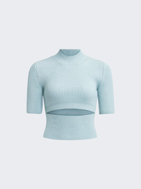 Details - Cropped silhouette - Short sleeves - Mock neck - Short sleeves - Cut out detailing - Care according to label - Material: 73% Wool, 27% Polyester - Model is 5'9"/175cm and is wearing a size FR36 Brand Style: AA9H1141K014A Designer/Brand: ALAIA