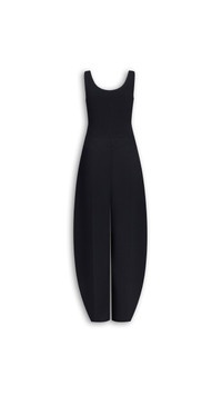DETAILS Round jumpsuit in crepe wool Round shape with low neckline, sleeveless, cinched waist, barrel leg, maxi length Side zip, silver hardware Made in Italy MATERIALS Highlights MAIN MATERIAL: 94% VIRGIN WOOL, 6% POLYAMIDE POCKET LINING: 100% COTTON PRODUCT REFERENCE: AA9U0040W132C-999