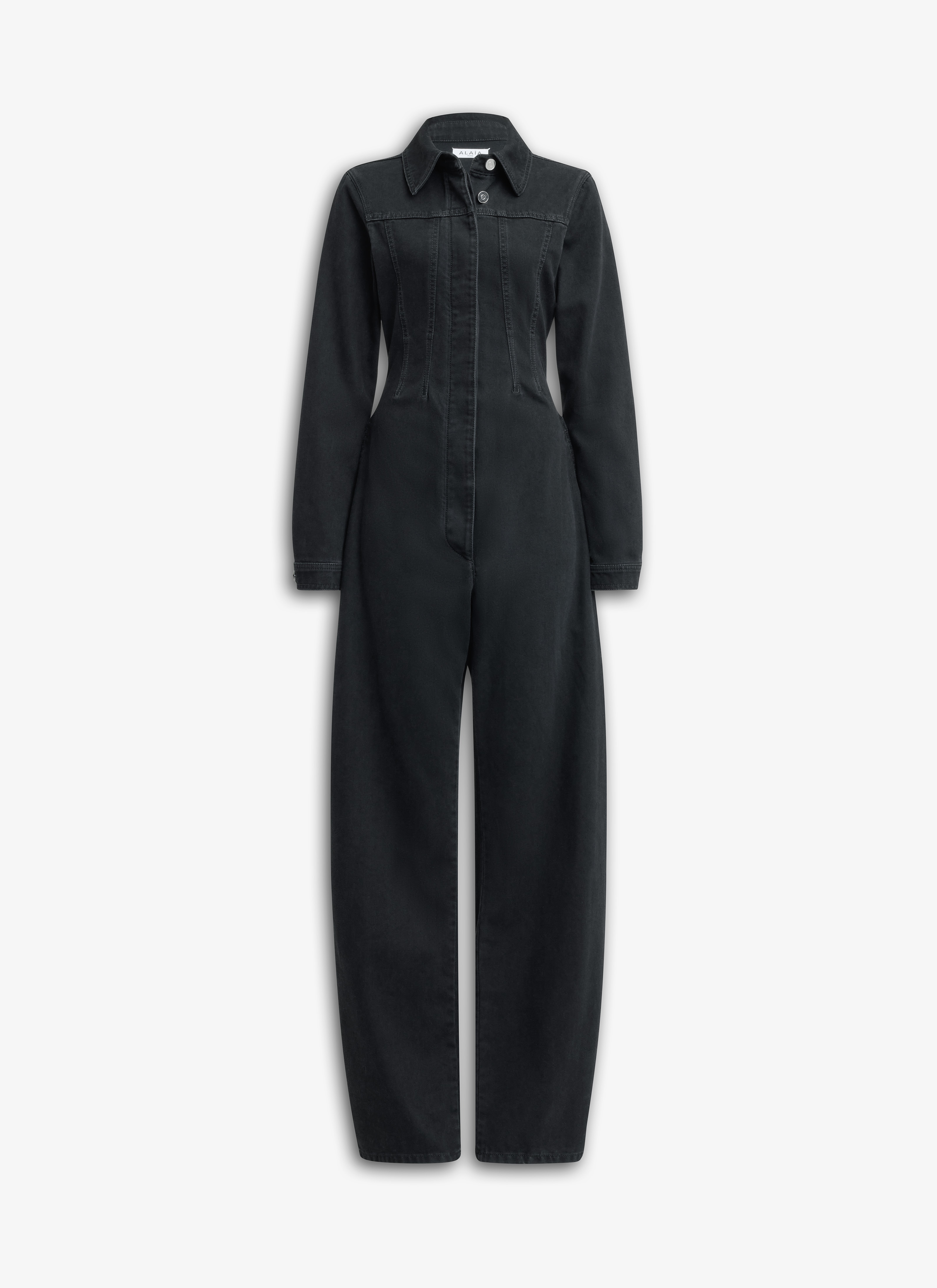 Black denim jumpsuit Fitted cut and curved legs Long sleeves, defined waist, matching topstitching, concealed buttonhole Made in Italy DETAILS COMPOSITION: 99% COTTON, 1% POLYURETHANE POCKET LINING: 65% POLYESTER, 35% COTTON PRODUCT REFERENCE: AA9P0297D003A - 995