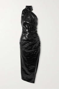 Ruched croc-effect vinyl halterneck midi dress