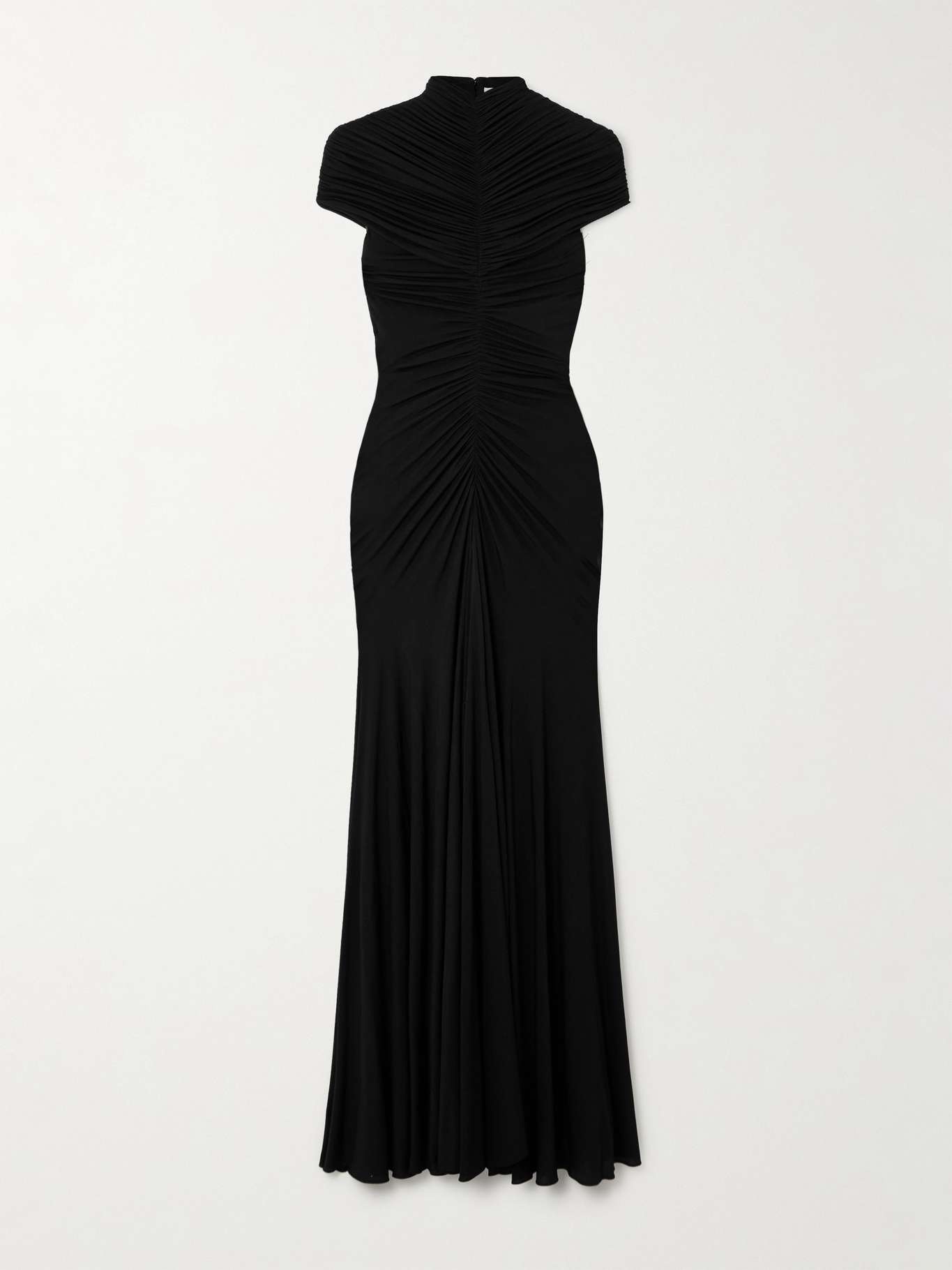 EDITORS'NOTES Alaia’s maxi dress is artfully ruched throughout to accentuate your natural frame. It’s made from soft jersey that fits close through the body and falls to a softly pleated hem. Wear yours with strappy sandals. SIZE & FIT Model measurements: - Fits true to size, take your normal size - Designed for a close fit - Lightweight, stretchy fabric - Model is 177cm/ 5'10" and is wearing a FR 36 - Bust: 79cm/ 31" - Waist: 61cm/ 24" - Hip: 89cm/ 35" DETAILS & CARE - Black jersey - Concealed hook and zip fastening at back - 96% viscose, 4% elastane - Dry clean