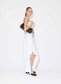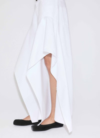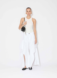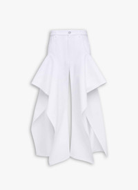 Asymmetrical ruffle jeans in white denim Low rise,curved panels with open-front ruffle hems, wide leg, hardware denim buttons, tonal topstitching details, four pockets Flare cut Made in Italy DETAILS MAIN MATERIAL : 100% COTTON PRODUCT REFERENCE : AA9P1199D002B - 000