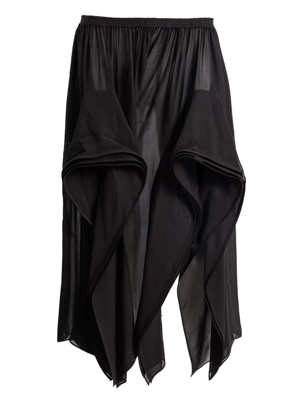 ruffled asymmetric trousers Highlights - Black - Ruffled detailing - Asymmetric hem - Elasticated waistband - Draped fabric Made in France Composition Viscose 100% Washing instructions Read Manufacturer Guidelines